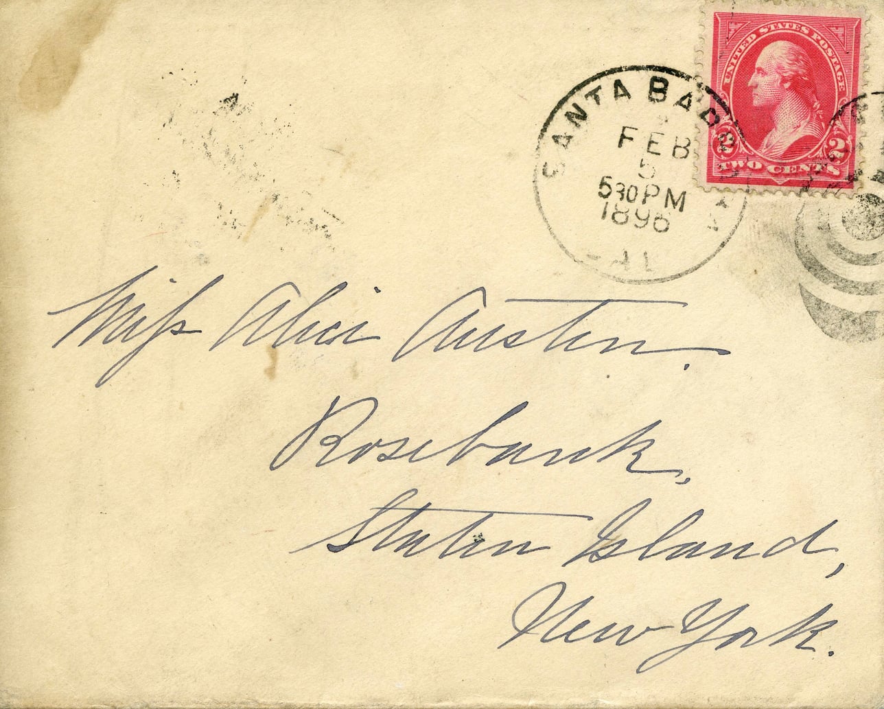 @envelope_santabarbara_martin_1896:document {recipient: @alice_austin, origin: @santa_barbara, destination: @staten_island, note: "Rosebank address"}