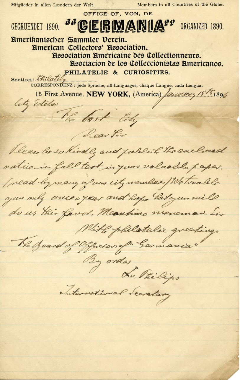 @file_1896_1_15_1896_jan_2001_copy_jpg:file {ocr_text: "Mitglieder in allen Ländern der Welt. Members in all Countries of the Globe.\n\nOFFICE OF, VON, DE\n\nGEGRUENDET 1890. \"GERMANIA\" ORGANIZED 1890.\nAmerikanischer Sammler Verein.\nAmerican Collectors' Association.\nAssociation Americaine des Collectionneurs.\nAsociacion de los Colleccionistas Americanos.\nPHILATELIE & CURIOSITIES.\nSection: Philately\nCORRESPONDENZ: jede Sprache, all Languages, chaque Langue, cada Lengua.\n15 First Avenue, NEW YORK, (America) January 15th, 1896\n\nCity Editor\nThe Post City\n\nDear Sir,\n\nPlease be so kindly and publish the enclosed notice in full text in your valuable paper. I read by many of our city members. We trouble you only once a year and hope that you will do us this favor. Meantime remember Sir,\n\nWith philatelic greetings,\nThe Board of Officers of \"Germania\"\n\nBy order\nDr. Phillips\nInternational Secretary"}
