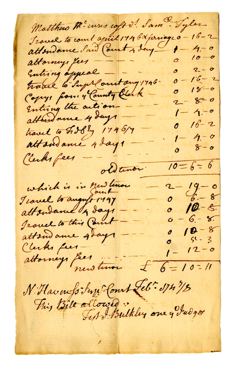 @mccure_vs_tylers_case -> incurred -> @court_attendance {amount: "3 days 0-8-0", when: @date_1746_11, description: "Attendance 3 days (Nov 1746)"}Matthews W. v. Sam. Tyler Travel to court April 1746 forriage 0-16-2 attendance 4 days $4-0 attorneys fees 0-10-0 Enticing appeal 0-2-0 Travel to Supr. Court Aug. 1746 0-16-2 Copy from County Clerk 0-18-0 Enticing the action 2-8-0 attendance 4 days 1-1-0 Travel to FSB by 1746/7 0-16-2 attendance 4 days 1-4-0 Clerks fees 0-8-0 Old term 10=6=6 Which is in New term Court 2-19-0 Travel to August 1747 0-6-8 attendance 4 days 0-10-5. Travel to this Court 0-6-8 attendance 4 days 0-10-8 Clerks fees 0-5-3 attorneys fees 1-12-0 New term £6=10=11 N. Haven's Supr. Court Feb. 1747/8 This bill allowed Test J. Buckley one of Judges
