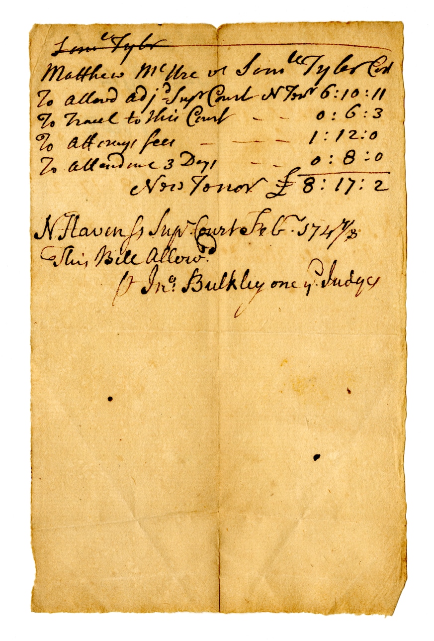 Lem Tyler Matthew McIre or Sam Tyler Esq To allow adj Supr Court Nov 6:10:11 To travel to this Court - 0:6:3 To attorneys fees - 1:12:0 To attend me 3 Day - 0:8:0 Now Total £8:17:2 N. Haven & Supr Court Fe C-574/73 This Bill Allow. P In: Bulkley one of Judge