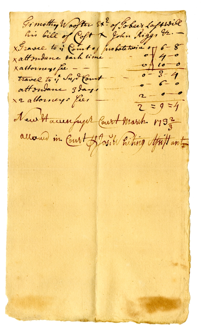 @costs_document -> derived from -> @file_rg003_nhsc_baai_ps_costs_wooster_001_jpgTimothy Wooster Esq. of Tobee's Last Will his bill of Coft & John Riggs Esq. x Travel to 1/2 Count of probate twice 0-6-8 x attendance each time 0-4-0 x attorney's fee 0-10-0 travel to 1/2 Sup'd Court 0-3-4 attendance 3 days 0-6-0 x 2 attorney's fees 2-0-0 2 = 9 = 4 New Haven Super Court March 1732/3 allowed in Court by Jos: Whiting Att'nt