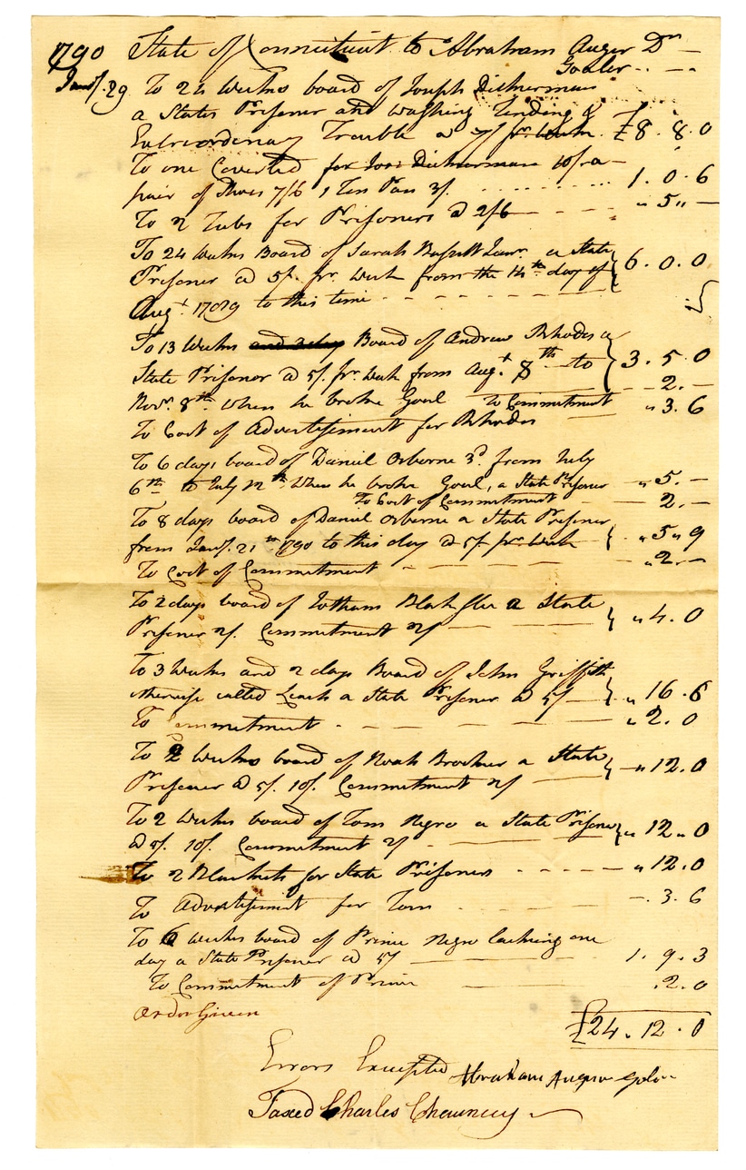 @court_expenses_augur_abraham -> location -> @new_haven_connecticutState of Connecticut to Abraham Auger Esq. To 24 weeks board of Joseph Dickinson, a State Prisoner and washing, bedding & extraordinary trouble as per list. £8.8.0 To one covered for poor Dickinson 10/-a pair of shoes 7/6, 1 ten shillings 1.0.6 To 2 tubs for Prisoners 2/6 To 24 weeks board of Sarah Balfour Lewis, a State Prisoner 5/- for work from the 14th day of Aug. 1799 to this time 6.0.0 To 13 weeks board of Andrew Rhodes, a State Prisoner 5/- for work from Aug. 8th to Nov. 8th when he broke Goal. To commitment 3.6 To cost of advertisement for Andrew To 6 days board of Daniel Osborne Esq. from July 6th to July 12th when he broke Goal, a State Prisoner 5.- To board of commitment 2.- To 8 days board of Daniel Osborne a State Prisoner from Jan. 21 to 29th to this day 2/6 per week 5.9 To cost of commitment 2.- To 2 days board of Nathan Black for a State Prisoner of commitment 4.4.0 To 3 weeks and 2 days board of John Griffith otherwise called Leach a State Prisoner 5.7.- To commitment 2.0 To 2 weeks board of Noah Brooks a State Prisoner 5/- 12.0 To 2 weeks board of Tom Myre a State Prisoner 12.0 2d of 10f. commitment 2f. 4.12.0 To 2 blanchets for State Prisoners 3.6 To advertisement for Tom 3.6 To 6 weeks board of Prine Nigw lacking one day a State Prisoner 5/- 1.9.3 To commitment of Prine 2.0 Or do gaven £24.12.0 Errors corrected Abraham Auger Esq. Filed Charles Chevercy