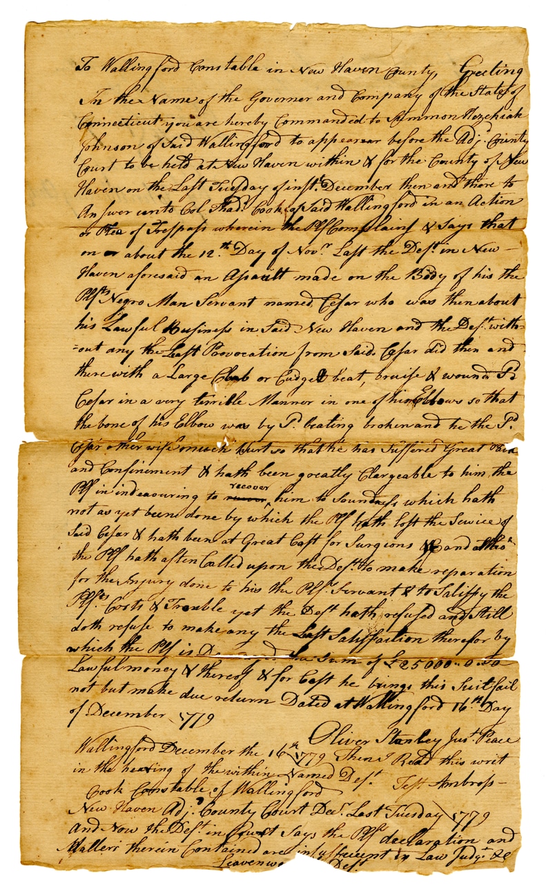 @file_rg003_nhsc_baai_ps_courtappeals_johnson_001_tif -> related to -> @court_appeal_documentTo Wallingford Constable in New Haven County, Greeting, In the Name of the Governor and Company of the State of Connecticut you are hereby commanded to summon Joseph Johnson of said Wallingford to appear before the Adj. County Court to be held at New Haven within & for the County of New Haven on the Last Tuesday of next December then and there to Answer unto Col. Thos. Cook Esq. of said Wallingford in an Action of Ass &c. whereon the Plaintiff & says that on about the 12th Day of Nov. Last the Def. in New Haven aforesaid an Assault made on the Body of his the R.P.'s Negro Man Servant named Cesar who was then about his Lawful Business in said New Haven and the Def. without any the least Provocation from said Cesar did then and there with a Large Club or Cudgel beat, bruise & wound said Cesar in a very terrible Manner in one of his Elbows so that the bone of the Elbow was by P. beating broken and he the P. & his other wife so much hurt so that he has suffered great pain and Confinement & hath been greatly Chargeable to him the Off in endeavouring to recover him to soundness which hath not as yet been done by which the Off hath lost the Service of said Cesar & hath been at great Cost for Surgeons &c. and also the Off hath often Called upon the Def. to make reparation for the Injury done to his the R.P.'s Servant & to Satisfy the R.P.'s Costs & Trouble yet the Def. hath refused and still doth refuse to make any the least Satisfaction therefor by which the Off is Damaged in a sum of £25000 &c. lawful money & thereof & for that he brings this Suit fail not but make due return Dated at Wallingford 16th Day of December 1779. Oliver Stanley Just Peace Wallingford December the 16th 1779 Thine I Read this writ in the meeting of the within named Def. Seth Harbrops Cook Constable of Wallingford New Haven Adj. County Court Day Last Tuesday 1779 and now the Def. in Quest says the Off declaration and Matter therein contained are in sufficient by Law Judg. &c. Leavenworth Def.