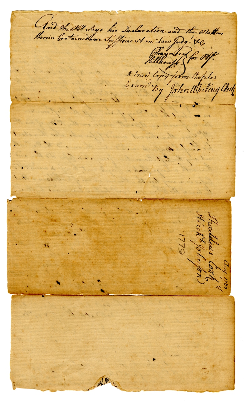 @file_rg003_nhsc_baai_ps_courtappeals_johnson_002_jpg:asset {ocr_text: "And the MT says his Declaration and the Matter therein Contained are Sufficient in Law Judg &c.\nPhasenbury for Opp.\nStillhous\nA true Copy from the files\nExam'd By John Whiting Chief\n\nFraddius Cook &\nMizick Johnson\n1779\n\nAug 1780"}