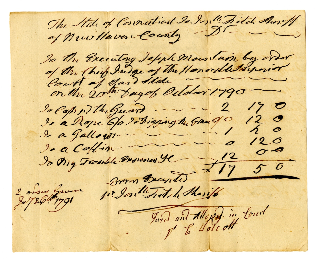 @connecticut_state_library -> maintains -> @nhsc_baai_cases_papers_subjectThe State of Connecticut To Jos M. Fitch Sheriff of New Haven County To the Executing Joseph Mountain by order of the Chief Judge of the Honorable Superior Court of said State on the 20th day of October 1790. To Capt. in the Guard 2 19 0 To a Rope &c & Digging the Ground 12 0 To a Gallows 1 h 0 To a Coffin 0 12 0 To My Trouble & services 12 0 0 Total £17 5 0 2 order given Jan 26th 1791 Executed Jos M. Fitch Sheriff Jared and Attorneys in Court P E Wolcott