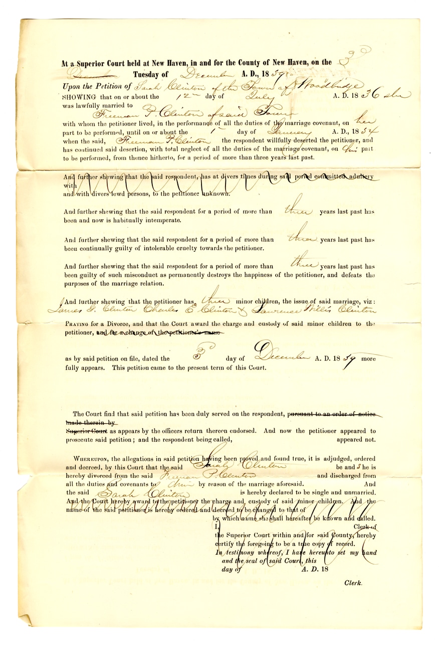 @file_rg003_nhsc_baai_ps_divorce_clinton_003_jpg:image {description: "Scanned image of the divorce decree for Sarah Clinton v. Freeman P. Clinton", ocr_text: "At a Superior Court held at New Haven, ...", source: "RG003_NHSC_BAAI_PS_Divorce_Clinton_003.jpg"}