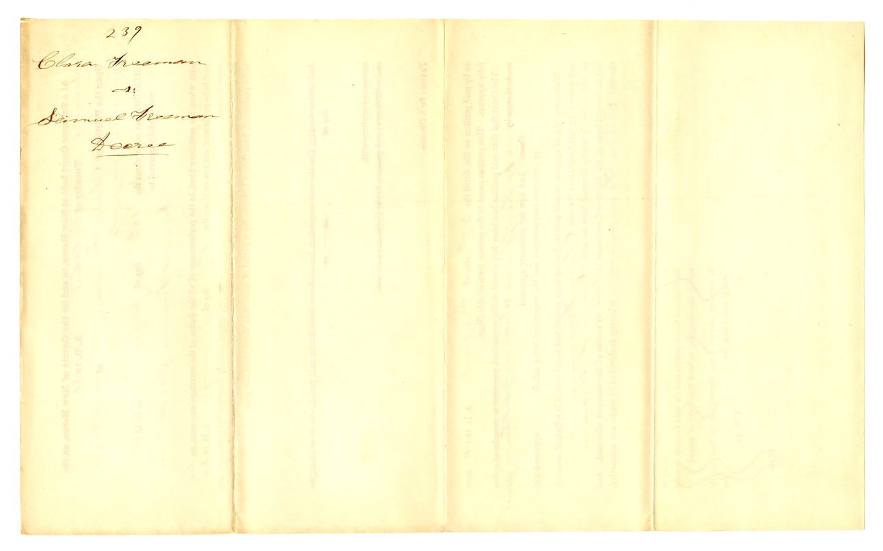 @file_pinax:file {title: "Clara Freeman vs. Samuel Freeman Divorce Case Collection", type: "Collection", creator: ["Clara Freeman", "Samuel Freeman"], institution: @connecticut_state_library, created: @date_1850, language: "en", subjects: [@divorce, @adultery, @desertion, @legal_documents, @new_haven_county_superior_court], description: "Collection of legal documents and images related to the divorce case of Clara Freeman vs. Samuel Freeman, filed in New Haven County Superior Court in 1850. The documents include the petition for divorce, notices, and court orders.", place: [@new_haven, @new_haven_county]}