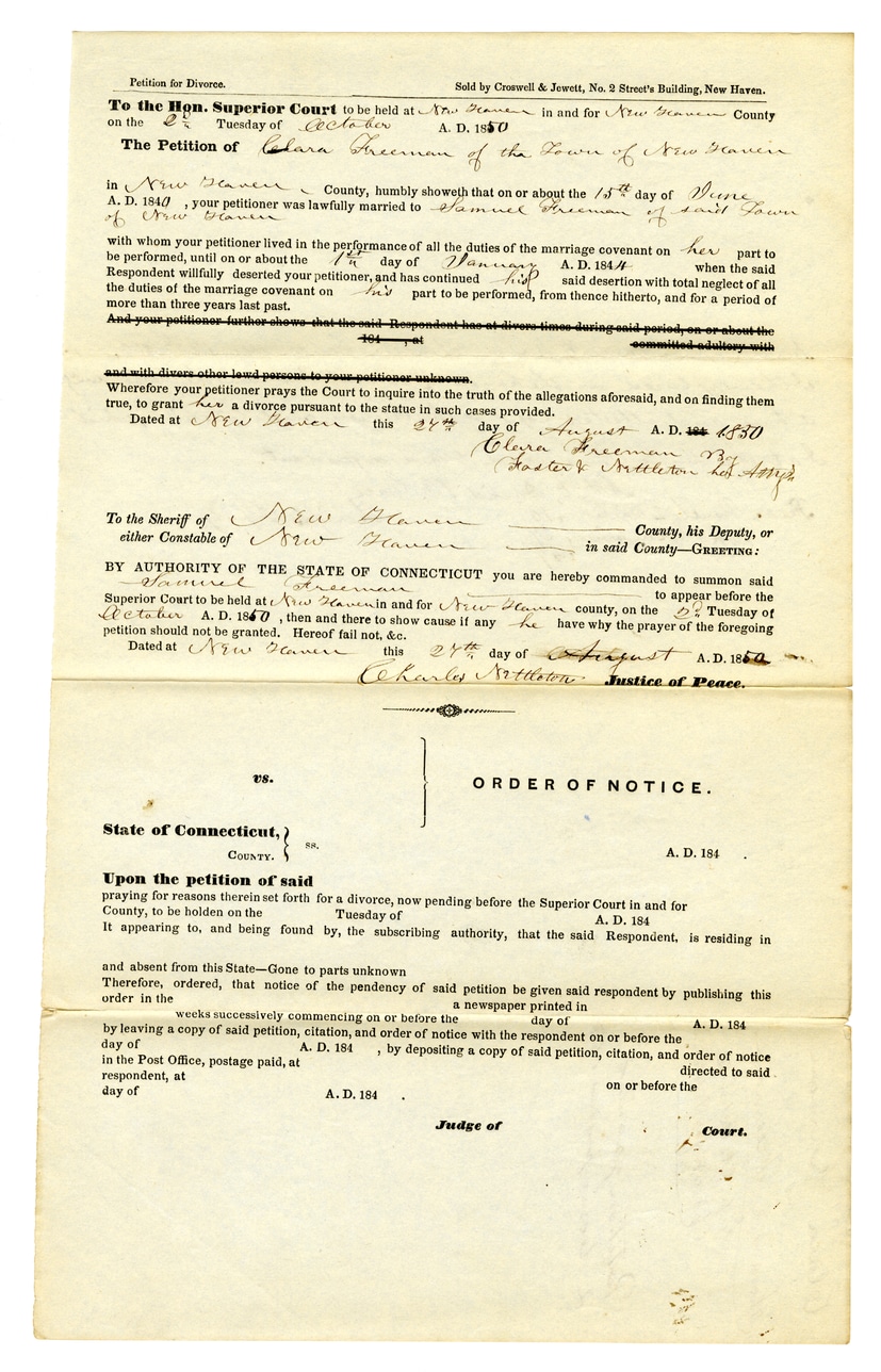 @file_pinax -> subject terms -> [@divorce, @adultery, @desertion, @legal_documents, @new_haven_county_superior_court]Petition for Divorce. Sold by Crosswell & Jewett, No. 2 Street's Building, New Haven. To the Hon. Superior Court to be held at New Haven in and for New Haven County on the 25th Tuesday of October A.D. 1850 The Petition of Clara Freeman of the Town of New Haven in New Haven County, humbly showeth that on or about the 15th day of June A.D. 1840, your petitioner was lawfully married to Samuel Freeman of said Town of New Haven with whom your petitioner lived in the performance of all the duties of the marriage covenant on her part to be performed, until on or about the 7th day of January A.D. 1844 when the said Respondent willfully deserted your petitioner, and has continued his said desertion with total neglect of all the duties of the marriage covenant on his part to be performed, from thence hitherto, and for a period of more than three years last past. And your petitioner further shows that the said Respondent has at diverse times during said period, on or about the 1st of each month, committed adultery with and with diverse other lewd persons to your petitioner unknown. Wherefore your petitioner prays the Court to inquire into the truth of the allegations aforesaid, and on finding them true, to grant her a divorce pursuant to the statute in such cases provided. Dated at New Haven this 24th day of August A.D. 1850 Clara Freeman (Signature) Hester & Nettleton, Lds Attys To the Sheriff of New Haven County, his Deputy, or either Constable of New Haven in said County—GREETING: BY AUTHORITY OF THE STATE OF CONNECTICUT you are hereby commanded to summon said Samuel Freeman to appear before the Superior Court to be held at New Haven in and for New Haven county, on the 25th Tuesday of October A.D. 1860, then and there to show cause if any he have why the prayer of the foregoing petition should not be granted. Hereof fail not, &c. Dated at New Haven this 24th day of August A.D. 1850 Charles Nettleton Justice of Peace vs. ORDER OF NOTICE. State of Connecticut, ss. COUNTY. A.D. 184 Upon the petition of said praying for reasons therein set forth for a divorce, now pending before the Superior Court in and for County, to be holden on the Tuesday of A.D. 184 It appearing to, and being found by, the subscribing authority, that the said Respondent, is residing in and absent from this State—Gone to parts unknown Therefore, ordered, that notice of the pendency of said petition be given said respondent by publishing this order in the weeks successively commencing on or before the day of A.D. 184 by leaving a copy of said petition, citation, and order of notice with the respondent on or before the day of A.D. 184, by depositing a copy of said petition, citation, and order of notice in the Post Office, postage paid, at respondent, at day of A.D. 184 directed to said on or before the Judge of Court.