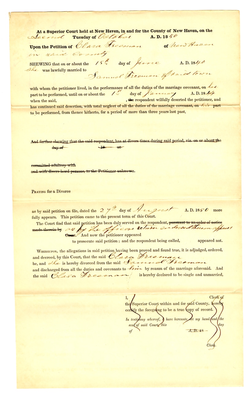 @petition_freeman_divorce:document {title: "Petition for Divorce", creator: @clara_freeman, date: @date_1850_08_24, filed_in: @new_haven_county_superior_court, subject: [@divorce, @adultery, @desertion]}
