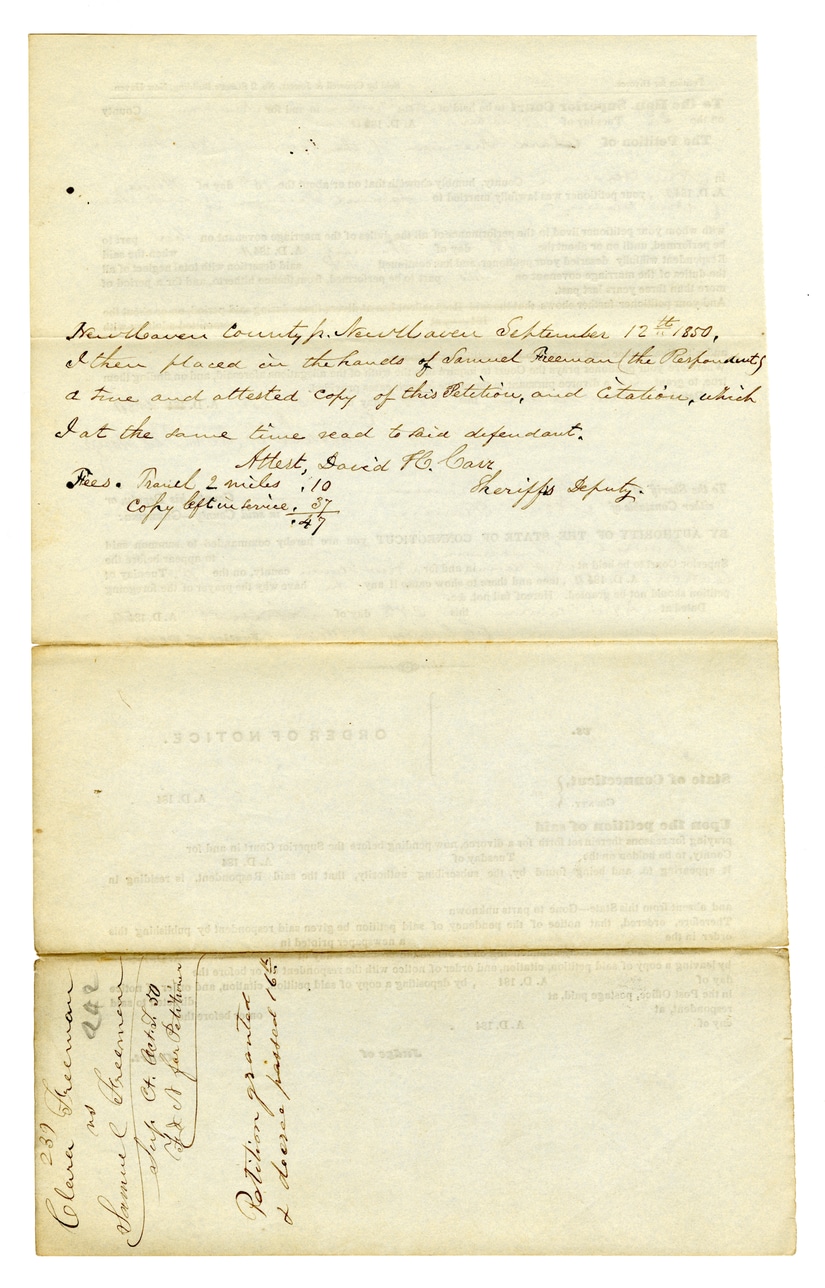 New Haven County, P. New Haven September 12th, 1850, I then placed in the hands of Samuel Freeman (the Respondent) a true and attested copy of this Petition, and Citation, which I at the same time read to said defendant. Attest, David F.C. Carr, Sheriff's Deputy. Fees: Panel 2 miles .10 Copy Septuagint .37 .47