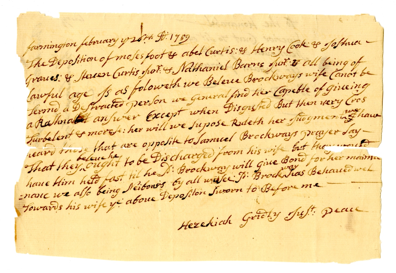 @nhsc_baai_cases_papers_subject:concept {description: "Subject index field for New Haven County Superior Court files related to Black, African American, and Indigenous cases and papers"}FARMINGTON FEBRUARY 12TH 1759 The Deposition of Moses Foot & Abel Curtis & Henry Cook & Joshua Graves & Steven Curtis & Nathaniel Barnes & all being of lawful age as followeth we believe Brockway's wife cannot be termed a distracted person we generally find her capable of giving a rational answer except when disgusted but then very cross, turbulent & more: her will we suppose redeth her fragmenting I have heard those that are opposite to Samuel Brockway's prayer say—That they believe he ought to be discharged from his wife but they would have him held fast till he & Brockway will give bond for her mainenance we also being Neighbors by all wise Ti. Brock has behaved well towards his wife ye above deposition sworn to before me— Hezekiah Gerity Jus. Peace