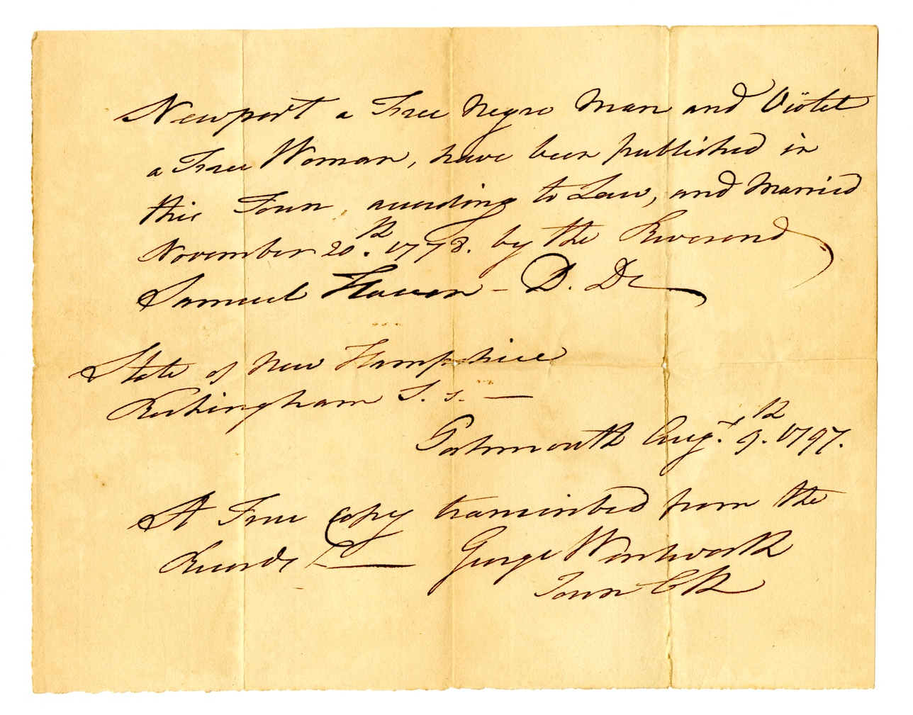 @nhsc_baai_cases_papers_subject -> part of -> @new_haven_county_superior_court_filesNewport, a Free Negro Man and Dickett a Free Woman, have been published in this Town according to Law, and Married November 20, 1793, by the Reverend Samuel Hanson - D.D. State of New Hampshire Rochingham T. & - Portsmouth Aug. 1st 18 A True Copy transcribed from the Record George Northworth Town Clerk
