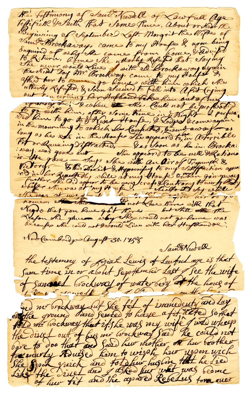 @nhsc_baai_cases_papers_subject -> applies to -> @new_haven_county_superior_court {focus: "Black, African American, and Indigenous cases"}Re: Testimony of Sarah Newell of Lawfull Age Testified to with that same time, about or near the beginning of September left Margaret the wife of Samuel Brockaway came to my house & upon being enquired of as why she came from home, & desired to return, answer she utterly refused that, saying she never would live with Mr. Brockaway again. The next day Mr. Brockaway came to my house & asked her to go home with him which she utterly refused, & soon seemed to fall into a fit (crying out concerning her husband take him out of my presence). Though she could not be persuaded to go with him, after some time in night I persuaded him to go to Margaret's house, & lodged there again in the morning to which she confessed, went away as long as he was in the house she appeared to be in a horrible fit or raving distracted. As soon as he is back, way was gone but she appeared to be well. Rather is she gone—says she with an air of triumph & victory. To this deceit & hypocrisy to my satisfaction appeared in her repeatedly while at my house. When going away further she did appear to be very cross & contrary to everybody where she was at "my house." She also did say while she was at my house she would not live here with that regard that you have got there but while the reason she gave why she would not go home was because she could not & would not live with her husband. New Cambridge August 30, 1858 Sarah Newell The testimony of Josiah Lewis of Lawful age is that sum time in or about September last I see the wife of Samuel Brockaway of Waterbury at the house of Mr. Brockaway but she fell of immediately and lay on the ground and seemed to have a fit & cried so that told Mr. Brockaway that if she was my wife I wish whoever the devil out of her Mr. Brockaway said he could not dare to do that and said how mother or her brother for nearly raised him to wish her upon which she spoke quick and told her husband that he lie like the devil and I liked but what was become of her fit and she agreed to be led from over