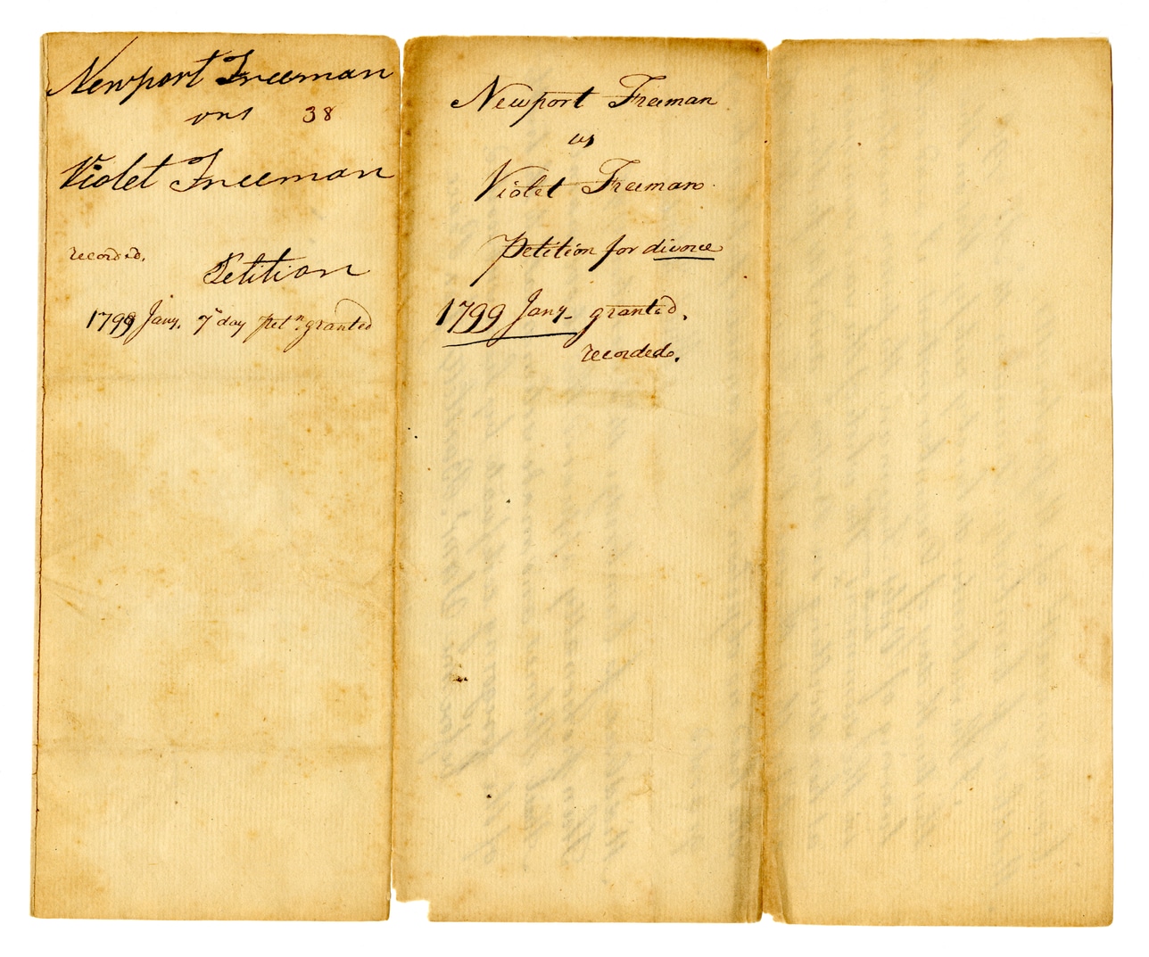 @divorce_grant_collection:document {title: "Newport Freeman vs Violet Freeman Divorce Grant Documents", creator: @new_haven_county_superior_court, institution: @connecticut_state_library, created: @date_1799_01_07, language: "en", description: "Collection of divorce grant documents from the New Haven County Superior Court involving Newport Freeman and Violet Freeman.", subjects: ["Divorce", "Legal Documents", "Black, African American, and Indigenous History"], place: "New Haven County, Connecticut"}