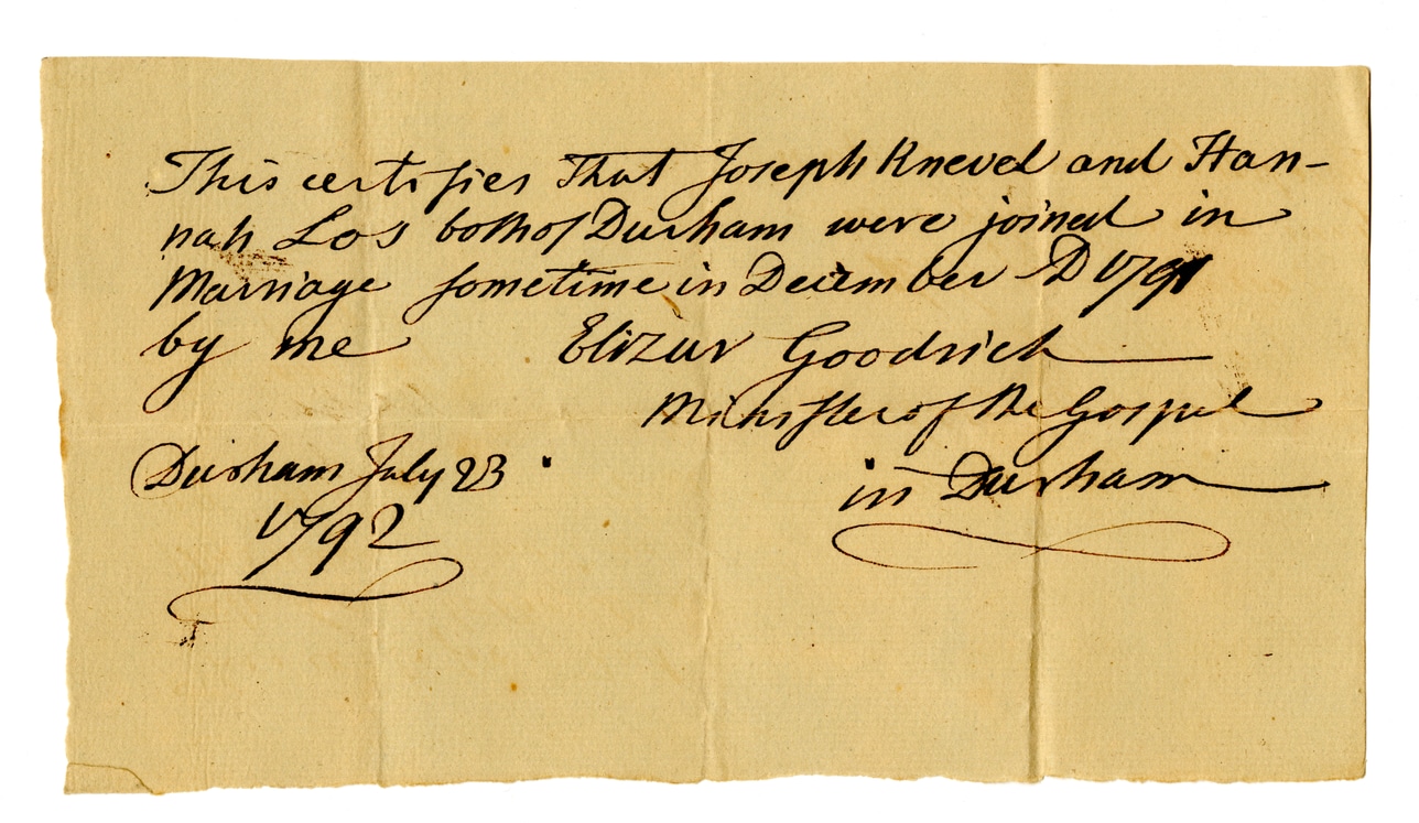 @marriage_certificate:document {title: "Joseph Knevel and Hannah Los Marriage Certificate", created: @date_1792_07_23, language: "en", description: "Marriage certificate for Joseph Knevel and Hannah Los, both of Durham, joined in marriage in December 1791 by Elizur Goodrich, Minister of the Gospel in Durham."}