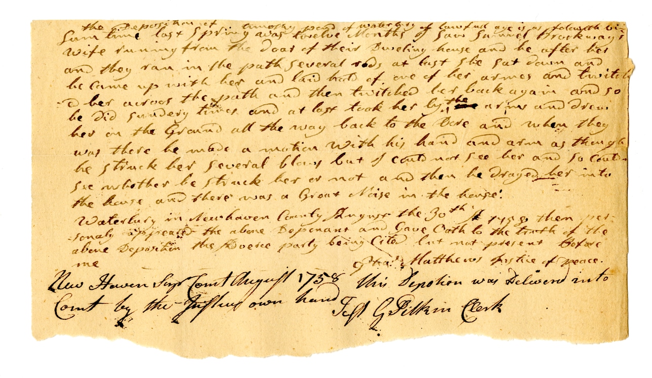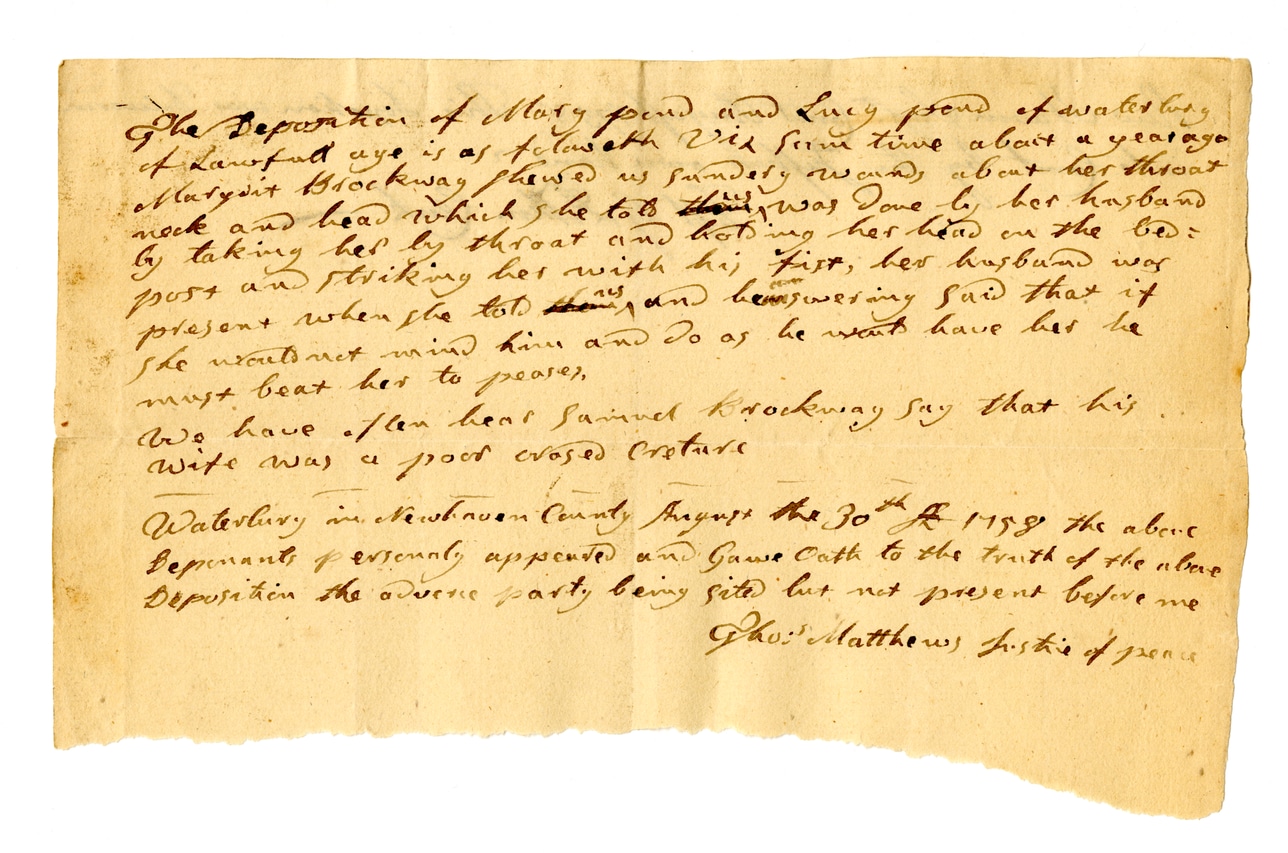 The Deposition of Mary pond and Lucy pond of Waterbury of Lawfull age is as followeth: Vix some time about a year ago Maryeit Brockway showed us sundry wounds about her throat neck and head which she told was done by her husband by taking her by throat and hocking her head on the post and striking her with his fist; her husband was present when she told us and he answering said that if she would not mind him and so as he would have his he must beat her to please. We have often heard Samuel Brockway say that his wife was a poor crossed creature. Waterbury in New Haven County August the 30th A.D. 1758 the above Dependants personally appeared and gave oath to the truth of the above deposition the adverse party being sick but not present before me Thos Matthews Justice of Peace