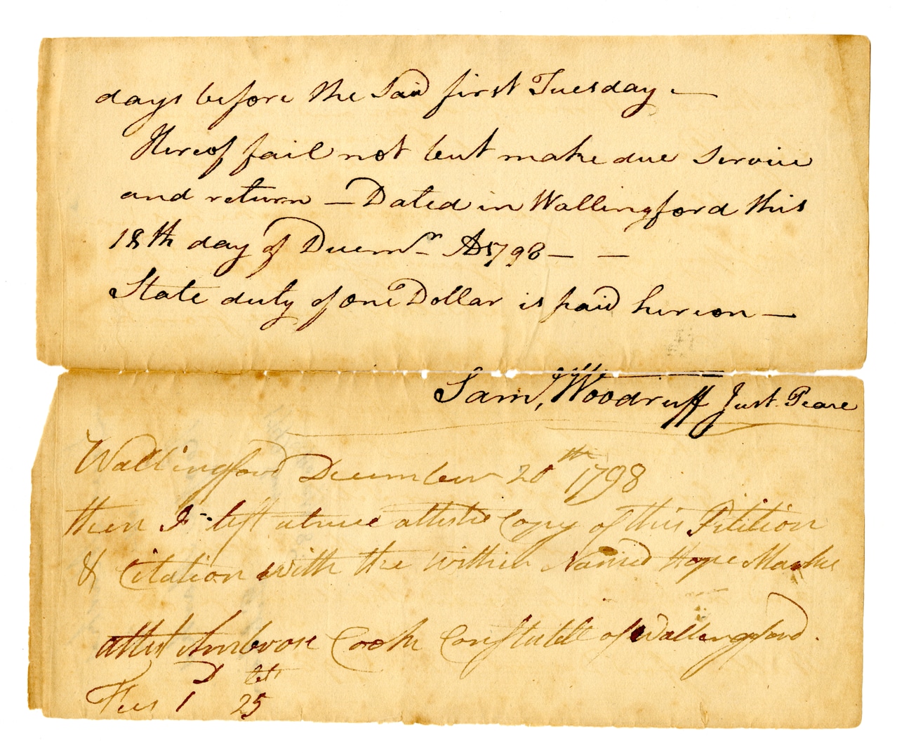 @divorce_petition_collection -> indexed by -> @nhsc_baai_cases_papers_subject days before the said first Tuesday— Therof fail not but make due return and return—Dated in Wallingford this 18th day of Decemr. A 1798— State duty of one Dollar is paid herein— I am, Wodruff Just Peare Wallingford December 20th 1798 then I left above attested copy of this Petition & Citation with thee within named Hope Masters Attent Humberson Cook Constable of Wallingford. Feb 1st Feb 1 25