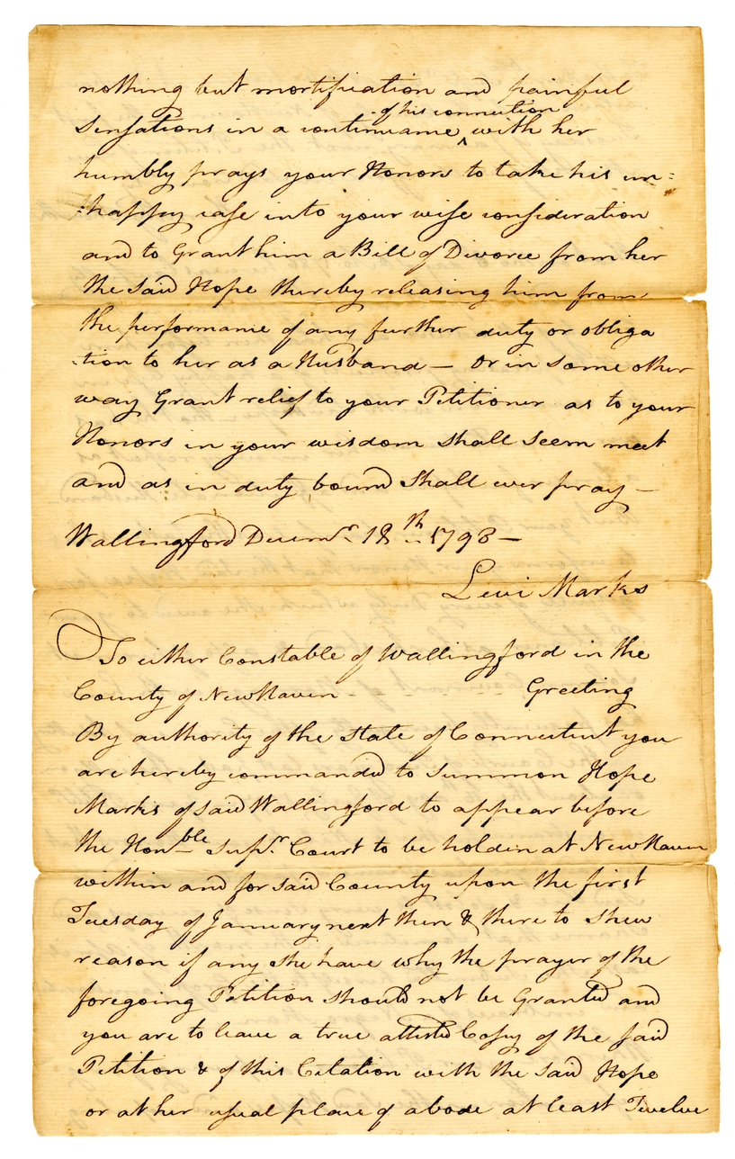 nothing but mortification and painful sensations in a continuance with her humbly prays your Honors to take him up: happy safe into your wise consideration and to grant him a Bill of Divorce from her the said Hope thereby releasing him from the performance of any further duty or obligation to her as a Husband—Or in some other way Grant relief to your Petitioner as to your Honors in your wisdom Shall seem meet and as in duty bound Shall ever pray— Wallingford Decembt 18th 1798 Lewi Marks To either Constable of Wallingford in the County of New Haven— Greeting. By authority of the State of Connecticut you are hereby commanded to summon Hope Marks of said Wallingford to appear before the Honble Supt Court to be holden at New Haven within and for said County upon the first Tuesday of January next then & there to shew reason if any she have why the prayer of the foregoing Petition should not be granted and you are to leave a true attested copy of the said Petition & of this Citation with the said Hope or at her usual place of abode at least twelve