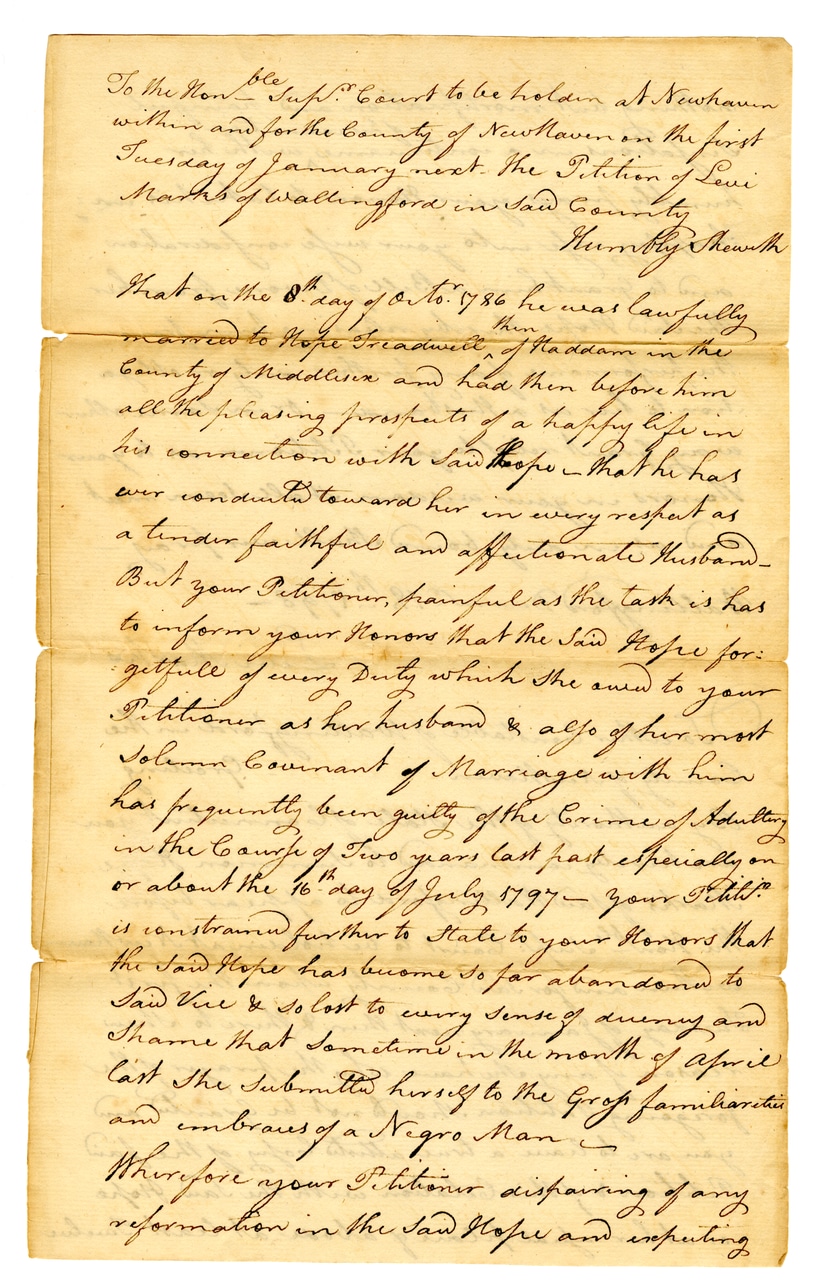 To the Honble Supr' Court to be holden at New Haven within and for the County of New Haven on the first Tuesday of January next. The Petition of Levi Marks of Wallingford in said County. Humbly Sheweth That on the 8th day of Octo. 1786 he was lawfully then married to Hope Broadwell of Haddam in the County of Middlesex and had then before him all the pleasing prospects of a happy life in his connection with said Hope—that he has ever conducted toward her in every respect as a tender, faithful, and affectionate husband—But your Petitioner, painful as the task is has to inform your Honors that the said Hope for want of every duty which she owed to your Petitioner as her husband & also of her most solemn Covenant of Marriage with him has frequently been guilty of the Crime of Adultery in the Course of Two years last past especially on or about the 16th day of July 1797—Your Petition is constrained further to State to your Honors that the said Hope has become so far abandoned to said Vice & so lost to every sense of decency and Shame that sometime in the month of April last she submitted herself to the gross familiarities and embraces of a Negro Man— Wherefore your Petitioner despairing of any reformation in the said Hope and expecting