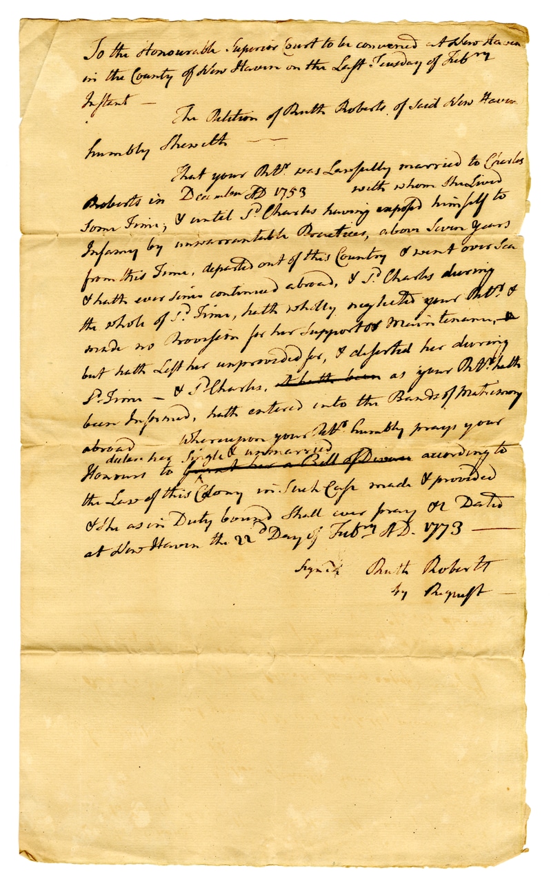 @file_rg003_nhsc_baai_ps_divorce_roberts_003_jpg -> part of -> @divorce_petition_documentsTo the Honourable Superior Court to be convened at New Haven in the County of New Haven on the Left Sunday of Feb 27th Instant— The Petition of Ruth Roberts of said New Haven humbly sheweth— That your PET was lawfully married to Charles Roberts in December A.D. 1753 with whom she lived some time; & until Sr. Charles having exposed himself to infamy by unwarrantable practices, about seven years from this time, departed out of this country & went over sea & hath ever since continued abroad, & Sr. Charles during the whole of Sr. time, hath wholly neglected your PET & made no provision for her support or maintenance, & but hath left her unprovided for, I deserted her during Sr. time—& Sr. Charles, hath been as your PET hath been imprisoned, hath entered into the Bands of Matrimony abroad. Whereupon your PET humbly prays your Honours to pass and have a Bill of Divorce according to the Law of this Colony in such case made & provided & she as in Duty bound shall ever pray on Date at New Haven the 22 Day of Feb'y A.D. 1773— Signed Ruth Roberts by Request