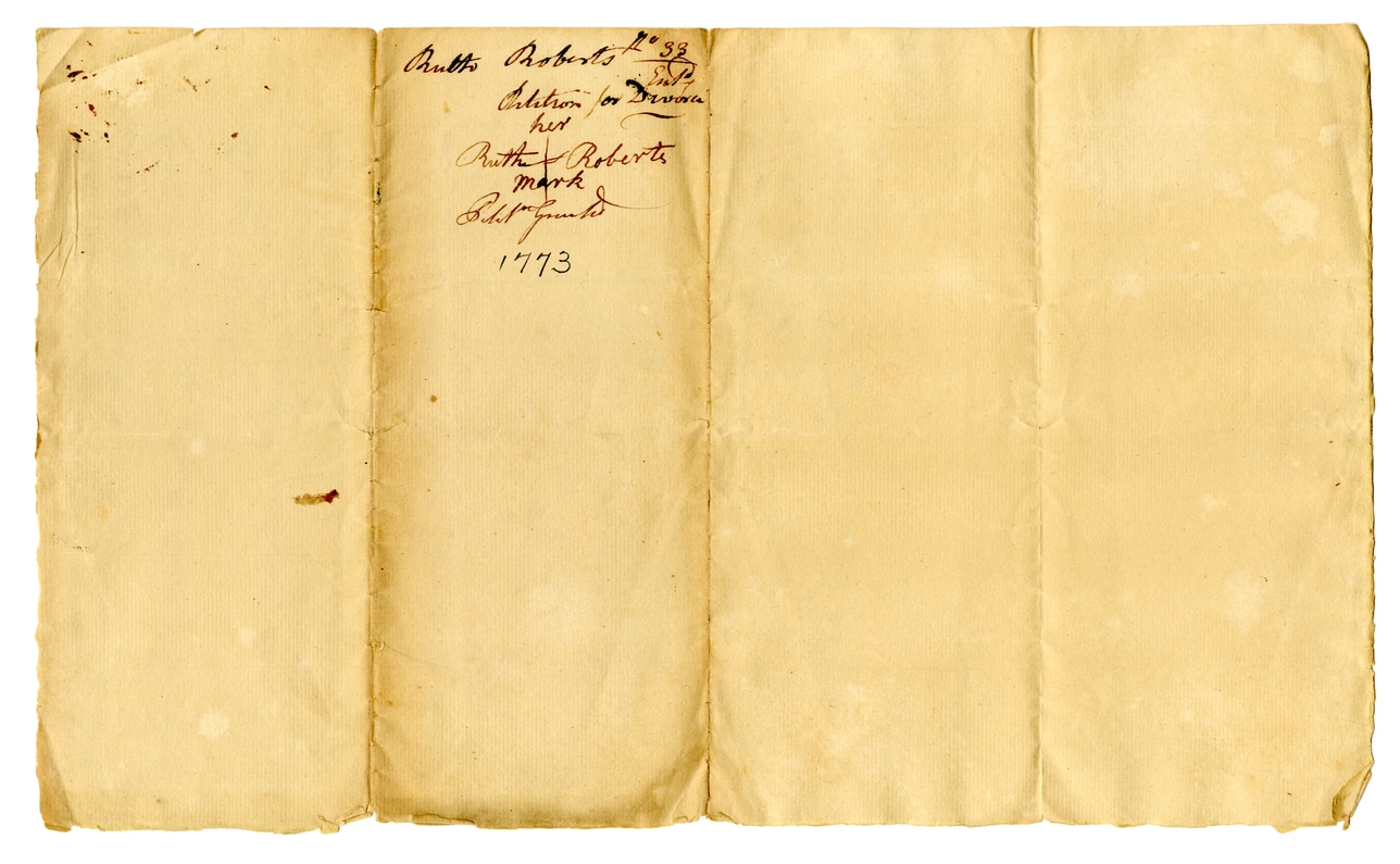 @nhsc_baai_divorce_case:collection {title: "New Haven County Superior Court Divorce Case Documents", creator: @new_haven_county_superior_court, institution: @connecticut_state_library, created: @date_1773, language: "en", subjects: ["Divorce", "Marriage", "Legal Documents", "Black, African American, and Indigenous History"], description: "Collection of documents related to a divorce case involving Ruth Roberts from the New Haven County Superior Court, part of the Black, African American, and Indigenous (BAAI) collection.", place: [@new_haven_county, @connecticut]}