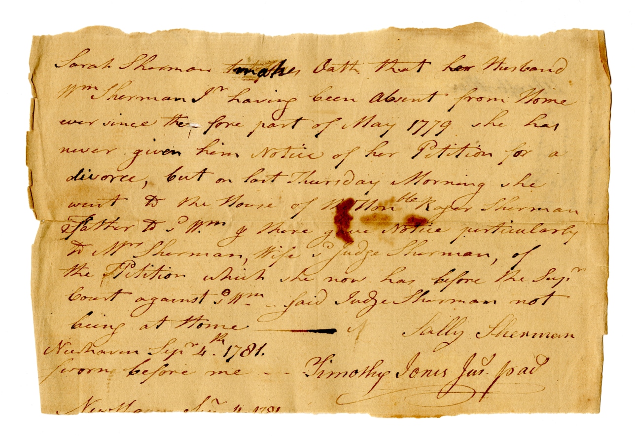 @file_rg003_nhsc_baai_ps_divorce_sherman_002_jpg:file {type: "image", description: "OCR of Sarah Sherman oath (Sept 4, 1781)", ocr_text: "Sarah Sherman takes oath that her husband Wm Sherman Jr having been absent from home ever since the fore part of May 1779 she has never given him notice of her petition for a divorce, but on last Thursday morning she went to the house of Mr. Honble Roger Sherman father to J.Wm & there gave notice particularly to Mr. Sherman, wife & Judge Sherman, of the petition which she now has before the say court against J.Wm said Judge Sherman not being at home Sally Sherman New Haven Sept 4, 1781 Sworn before me Timothy Jones Jr pd"}