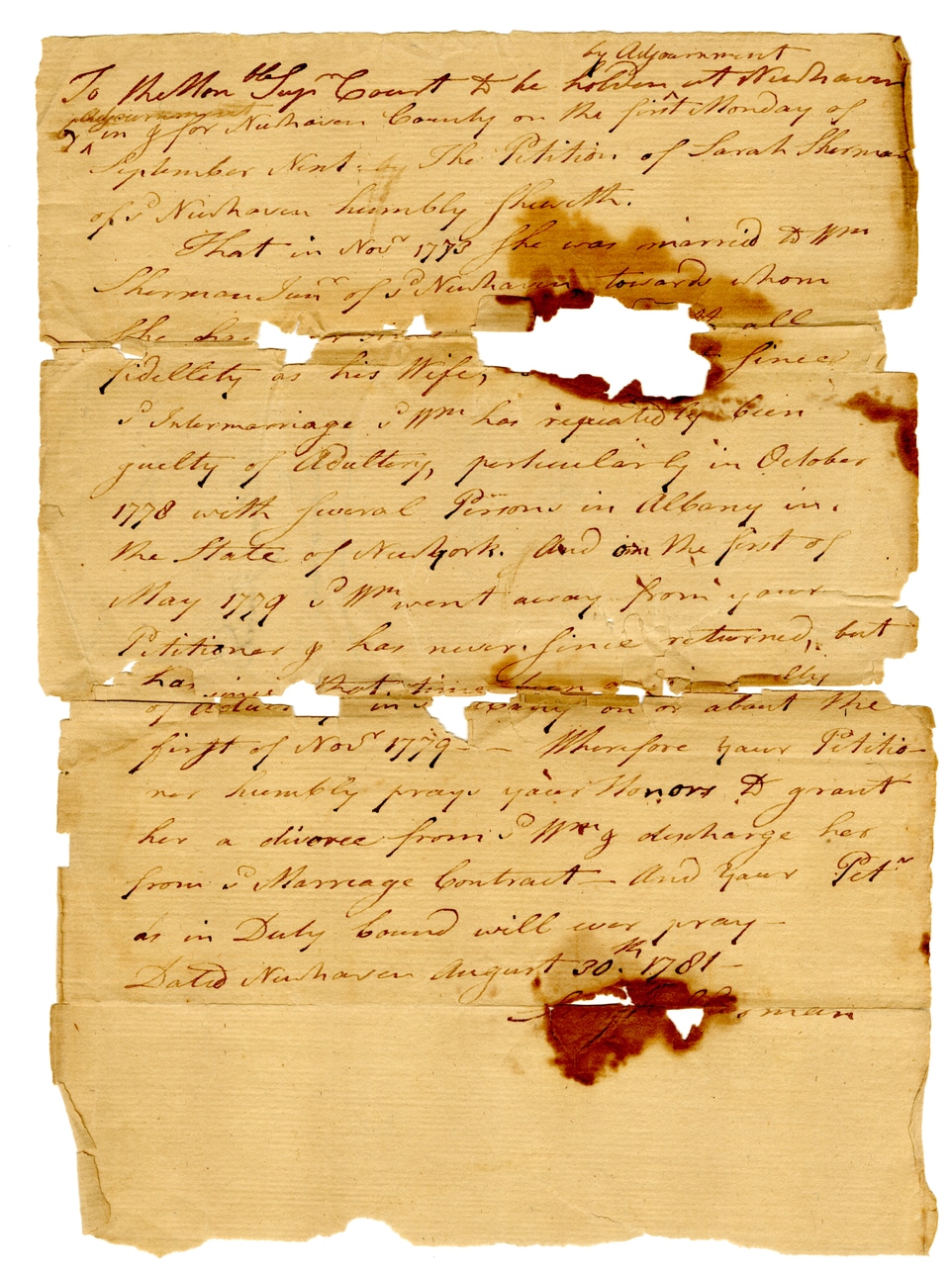 To the Hon'ble Court to be holden at the Haven by Adjournment for Nutkaven County on the first Monday of September next, by The Petition of Sarah Thomas of Nuthaven humbly sheweth. That in Nov 1773 she was married to Mr. Sherman Jun of S Nutkaven towards whom she has been true and faithful as his Wife, since Intermarriage &c has repeatedly been guilty of Adultery, particularly in October 1778 with several Persons in Albany in the State of New York. And on the first of May 1779 I Wm went away from your Petitioner & has never since returned, but has since that time been a prisoner of war, in company on or about the first of Nov 1779. Wherefore yours Petition- er humbly prays your Honors to grant her a divorce from I Wm & discharge her from a Marriage Contract. And yours Pet- ter as in Daily sound will ever pray— David Nuthaven August 30th 1781—
