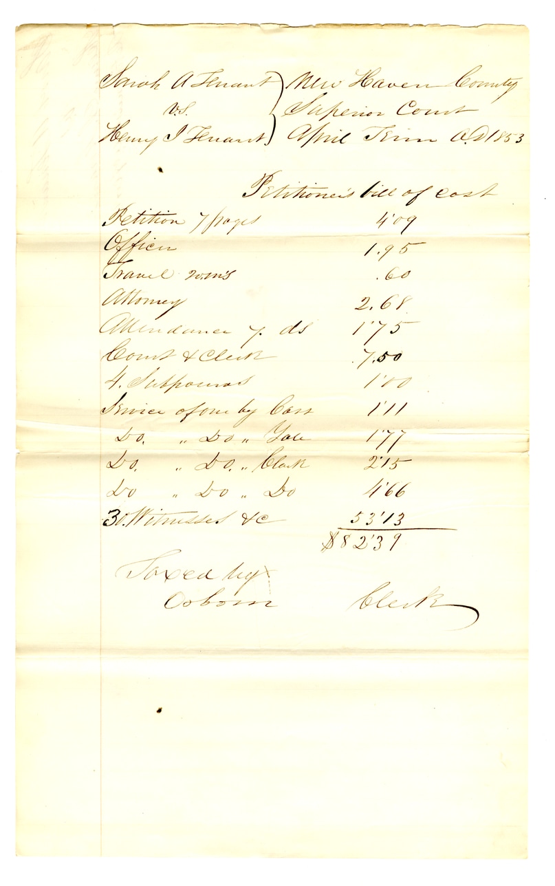 @nhsc_legal_costs_collection:collection {title: "New Haven County Superior Court Legal Costs Collection", creator: @new_haven_county_superior_court, institution: @connecticut_state_library, created: @date_1853, language: "en", subjects: ["Legal costs", "Divorce", "Tenant", "Court records", "Black, African American, and Indigenous history"], description: "Collection of legal cost documents from the New Haven County Superior Court, including a bill of costs for a divorce case involving Sarah A. Fennant and Henry I. Fennant.", place: [@new_haven_county, @connecticut]}