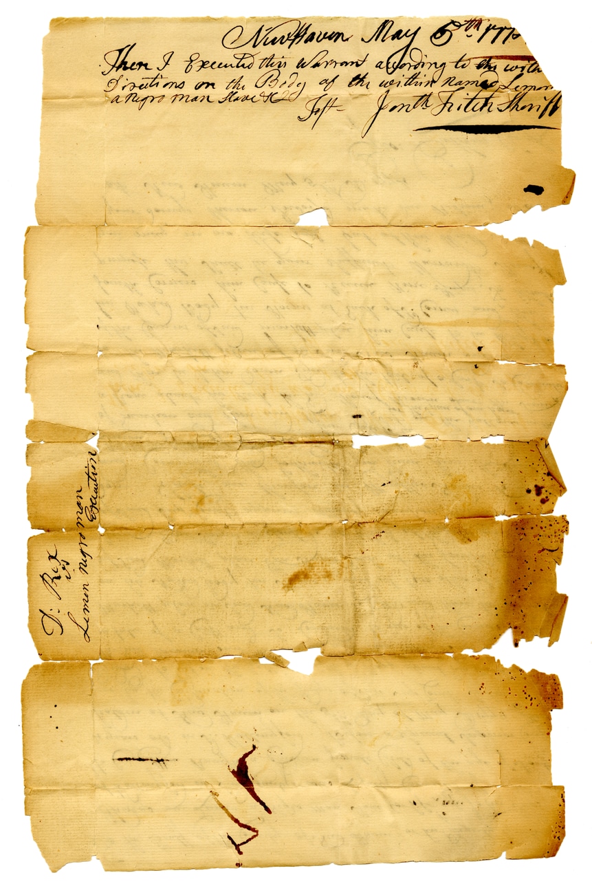 @file_rg003_nhsc_baai_ps_executions_rexvslemon_002_jpg:file {filename: "RG003_NHSC_BAAI_PS_Executions_RexvsLemon_002.jpg.ref.json", type: "Image/Asset with OCR", ocr_text: "North Haven May 6th, 1770\nThen I Executed this Warrant according to the written Directions on the Body of the without Name Negro man above.\nJoth Fitch Sheriff\n\nDr. Rick\nLemon Negro man Baptism"}