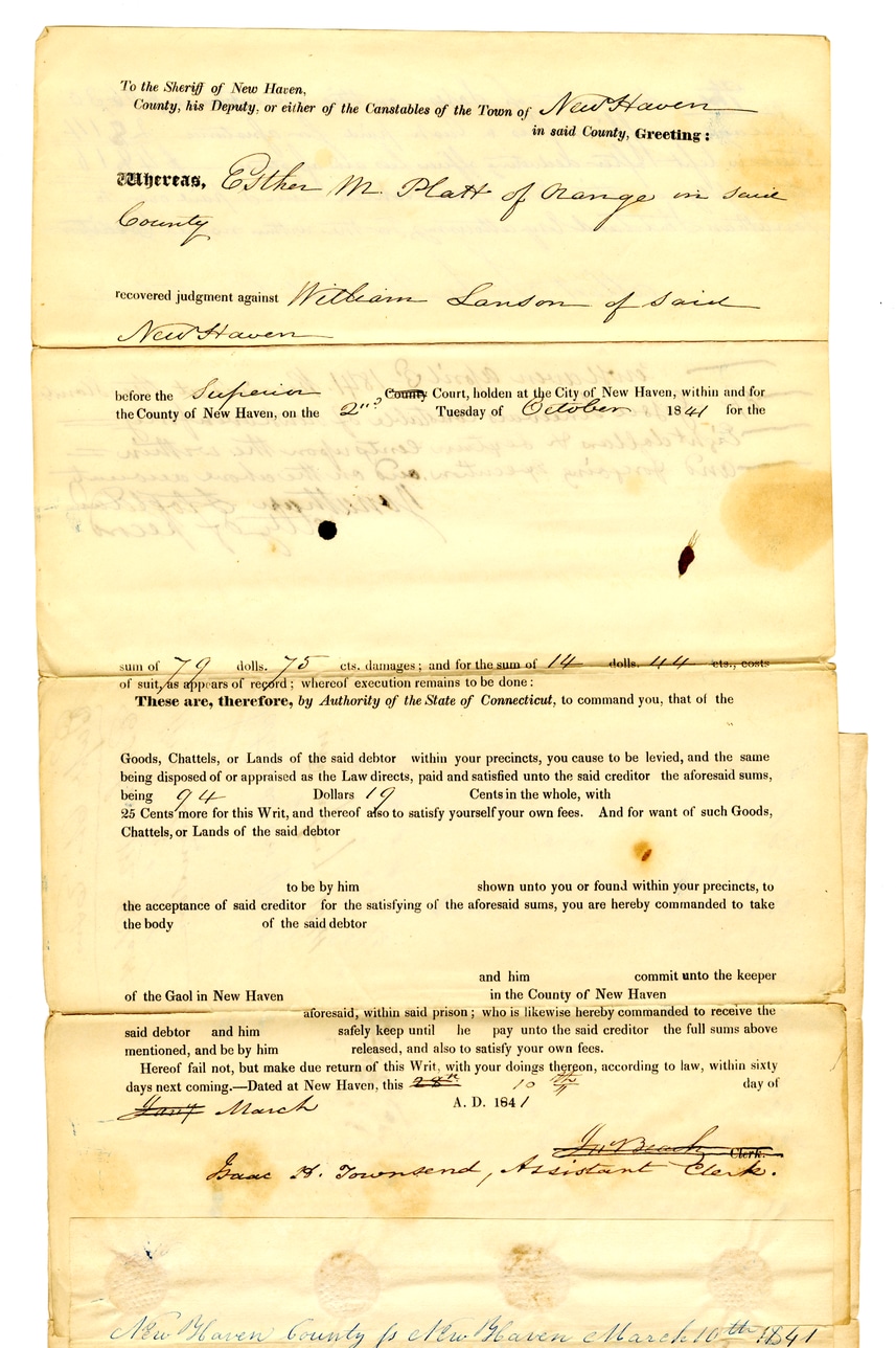 @execution_writ_platt_vs_lanson -> indexed by -> @nhsc_baai_cases_papers_subjectTo the Sheriff of New Haven, County, his Deputy, or either of the Canstables of the Town of New Haven in said County, Greeting: Whereas, Esther M. Platt of Orange in said County recovered judgment against William Lanson of said New Haven before the Superior County Court, holden at the City of New Haven, within and for the County of New Haven, on the 2nd Tuesday of October 1841 for the sum of 79 dollars, 75 cts. damages; and for the sum of 14 dollars, 44 cts., costs of suit, as appears of record; whereof execution remains to be done: These are, therefore, by Authority of the State of Connecticut, to command you, that of the Goods, Chattels, or Lands of the said debtor within your precincts, you cause to be levied, and the same being disposed of or appraised as the Law directs, paid and satisfied unto the said creditor the aforesaid sums, being 94 Dollars 19 Cents in the whole, with 25 Cents more for this Writ, and thereof also to satisfy yourself your own fees. And for want of such Goods, Chattels, or Lands of the said debtor to be by him shown unto you or found within your precincts, to the acceptance of said creditor for the satisfying of the aforesaid sums, you are hereby commanded to take the body of the said debtor and him commit unto the keeper of the Gaol in New Haven in the County of New Haven aforesaid, within said prison; who is likewise hereby commanded to receive the said debtor and him safely keep until he pay unto the said creditor the full sums above mentioned, and be by him released, and also to satisfy your own fees. Hereof fail not, but make due return of this Writ, with your doings thereon, according to law, within sixty days next coming.—Dated at New Haven, this 23d day of March A.D. 1841 James H. Townsend, Assistant Clerk