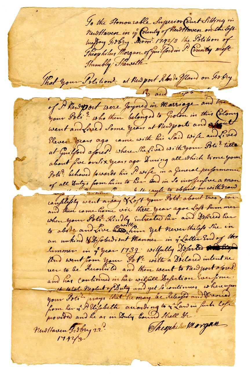 To the Honourable Superior Court Sitting in New Haven in & County of New Haven on the left Injory Febry. Aomi 1742/3 the Petition of Theophilus Morgan of Guilford in P. Country wtht Humbly Sheweth That your Petitioner at Newport Rhode Island on Febry. of P. Newport were Joyned in Marriage and was your Pti. who then belonged to Groton in this Colony went and lived Some years at Newport and about Eleven years ago came with his said wife and lived at Guilford afores. where she lived with your Pti. till about five or six years ago during all which time your Pti. behaved towards his P. wife in a general performance of all Dutys from him to her and in so inoffensive a man as might be able to absent or withdraw completely went away & left your Pti. about two year and then came home via three year agoe Left sum over when your Pti. kindly entreated her and desired her to abide and live with him yet nevertheless she in an unkind & Dishonourable manner in & Latter End of the summer in of year 1739 wilfully deserted and went from your Pti. with a Declared intent never to be Reunited and then went to Newport again and has continued in her willfull Deprition Ever since with total Neglect of Duty and yet so continues whereupon your Pti. prays that he may be Released and removed from her & P. Elizabeth according to Law in such case provided and he as in Duty bound Shall Be. New Haven Febry 22. 1742/3. Theophilus Morgan