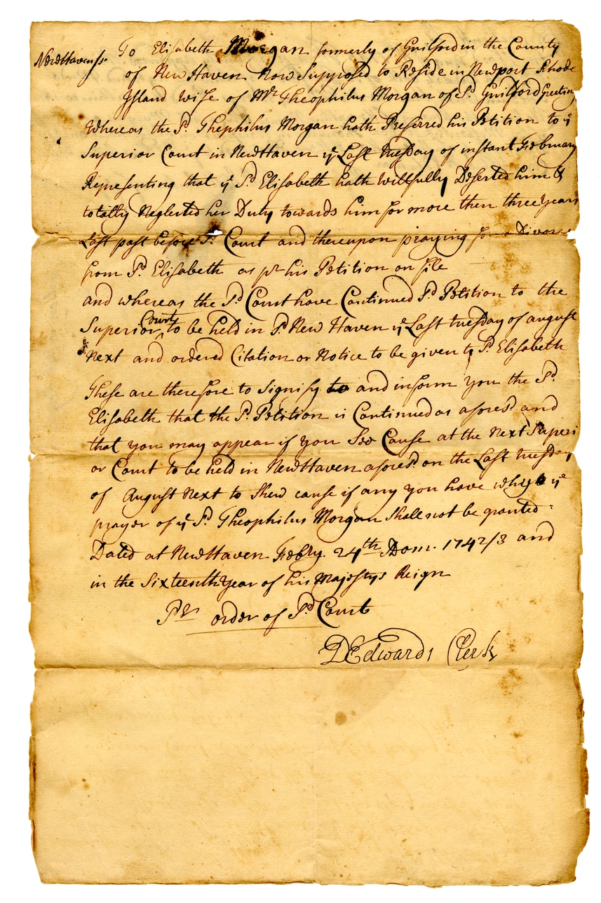 @elizabeth_morgan -> residence -> @newport_riNorth Haven, 1742/3 To Elizabeth Morgan, formerly of Guilford in the County of New Haven, now supposed to reside in Newport, Rhode Island, wife of Mr. Theophilus Morgan of P. Guilford, Guilford. Whereas the P. Theophilus Morgan hath preferred his petition to the Superior Court in New Haven & left the day of infant so many representing that if P. Elizabeth hath willfully deserted him & totally neglected her duty towards him for more than three years last past before the Court and thereupon praying for a divorce from P. Elizabeth as per his petition on file and whereas the P. Court have continued P. petition to the Superior Court to be held in P. New Haven & last the day of August next and ordered Citation or Notice to be given to P. Elizabeth. These are therefore to signify to and inform you the P. Elizabeth that the P. petition is continued as aforesaid and that you may appear if you see cause at the next Superior Court to be held in New Haven aforesaid on the last meeting of August next to shew cause if any you have why a 1st mayor of P. Theophilus Morgan shall not be granted. Dated at New Haven Febr. 24th 1742/3 and in the Sixteenth year of his Majesty's reign. By order of P. Court D. Edwards Clerk