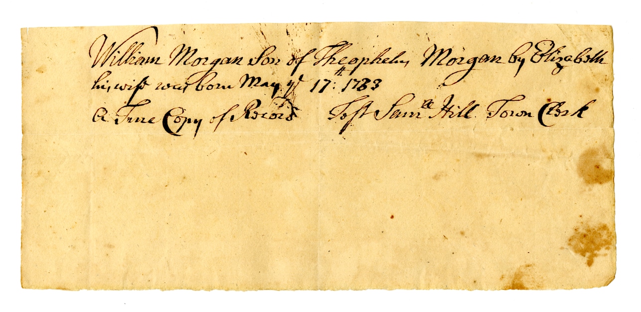 @file_rg003_nhsc_baai_ps_divorce_morgan_015_tif -> depicts -> @evidence_record_morgan_015William Morgan Son of Theophelia Morgan by Elizabeth his wife was born May 17, 1783 A true Copy of Record To P Sam Hill Town Clerk