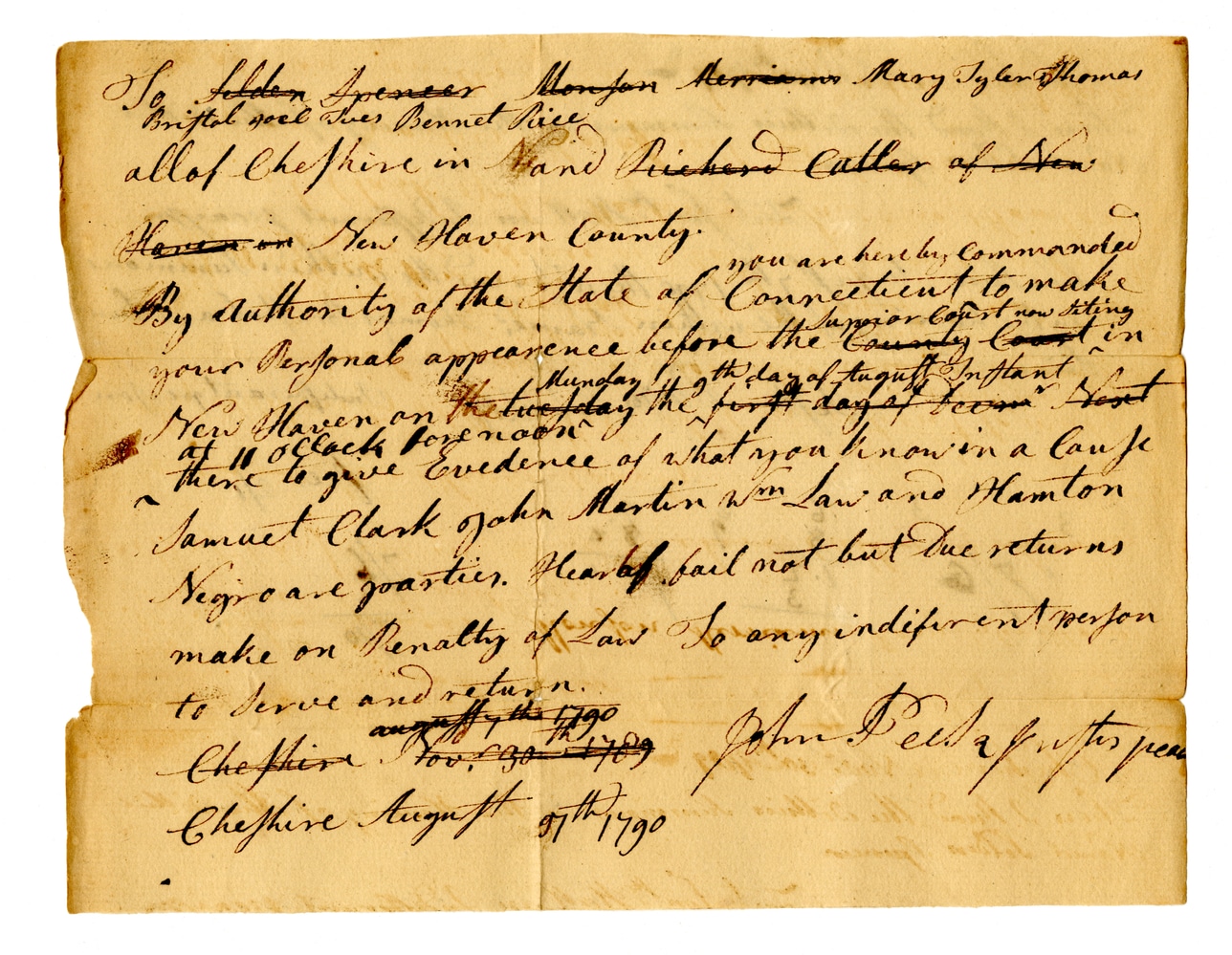 @hampton_vs_martin_clark_collection -> includes -> [@file_rg003_judgment_003, @file_rg003_judgment_004, @file_rg003_judgment_005, @file_rg003_judgment_006, @file_rg003_judgment_007]To John Spencer, Morton Harrison, Mary Tyler Thomas, Bristol Joel Dres, Bennet Rice, all of Cheshire in New Haven County. You are hereby commanded by authority of the State of Connecticut to make your personal appearance before the Superior Court now sitting in New Haven on Monday, 9th day of August instant at 11 o'clock forenoon there to give evidence of what you know in a cause between Samuel Clark of John Martin Wm Law and Hampton Negro as parties. Hearing fail not but due returns make on Penalty of Law. So any indifferent person to serve and return. Cheshire Augt 9th 1790 John Peck Jr pro pr