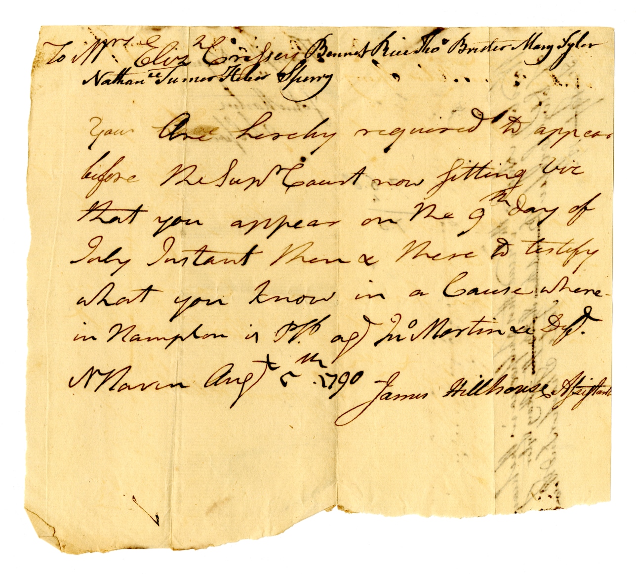 To Mr. Eliz Conifer Bennett & Thos Butler Mary Tyler Nathan Turner Alice Sperry You are hereby required to appear before the Sup Court now sitting here that you appear on the 9th day of July Instant there & there to testify what you know in a Cause where in Nampton is P.P. at Mc Norton &c Esq. N. Haven Augt 5, 1790 James Hillhouse Assistant