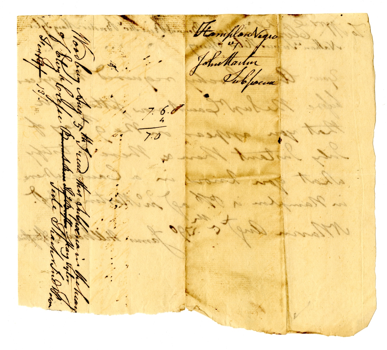 Hampden Nego John Martin Subpoena Now being day 5th year then subpoena'd the town of blythville Pa and then Sept 10 they order John Henry 13th