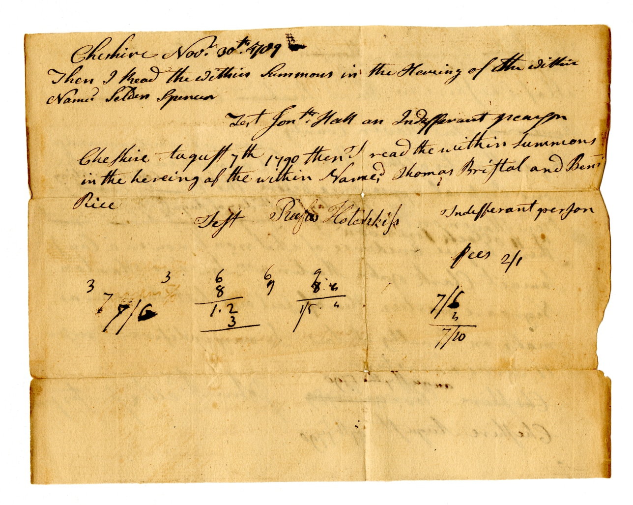 Cheshire Nov. 20th 1799 Then I read the within summons in the hearing of the within name? Selden Spencer Left Jon to Hall an Indifferant person Cheshire taught 7th 1790 then I read the within summons in the hearing of the within name, Thomas Bristol and Beni Rice Left Precis Holtskiff Indifferant person 3 3 6 6 8 8 6 6 7 9/6 1.2 3 7/5 4 7/6 7/10