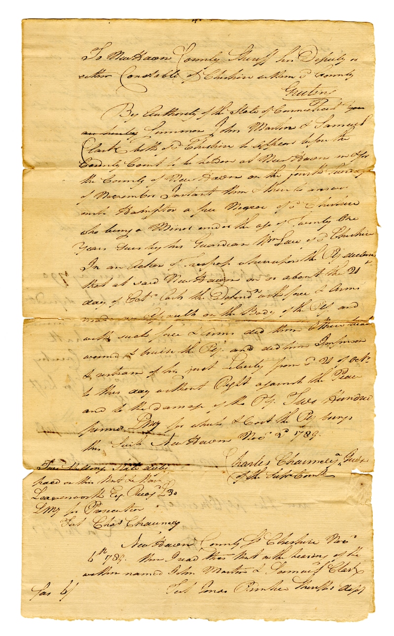 To the Honorable Samuel Smith & his Deputy or other Constable of Cheshire within New Haven County. Gentlemen: By Authority of the State of Connecticut you are hereby Summoned John Martin & Samuel Clark both of Enfield & Stephens before the County Court to be held at New Haven on the 21st day of November Instant then & there to answer with Hampton a free Negro of St. Christopher who being a Minor under the age of Twenty One Years, Tuesday last Guardian McLane of St. Christopher In an Action of Assault & Battery against the Defendant that at said New Haven on or about the 21st day of Oct last the Defendant with force & arms made an Assault on the Body of the Plaintiff and with such force & arms did then & there beat woman I know the Plaintiff and did then & there & continue of his just & only from 2 O'Clock & this day without Right against the Plaintiff and to the damage of the Plaintiff Hundred Pounds. For which I shall & must the Plaintiff sue. New Haven Novr 3 1789 Samuel Smith State Deputy Charles Chauncey Judge of the Superior Court Leavenworth Esq Propr 290 Dwyer & Princeton Jud Charles Chauncey New Haven County St. Christopher Novr 6 1789 Then I read that that in the hearing of the witness named John Martin & Samuel Clark Jas 6/1 Jud James Bunker Judge Asst