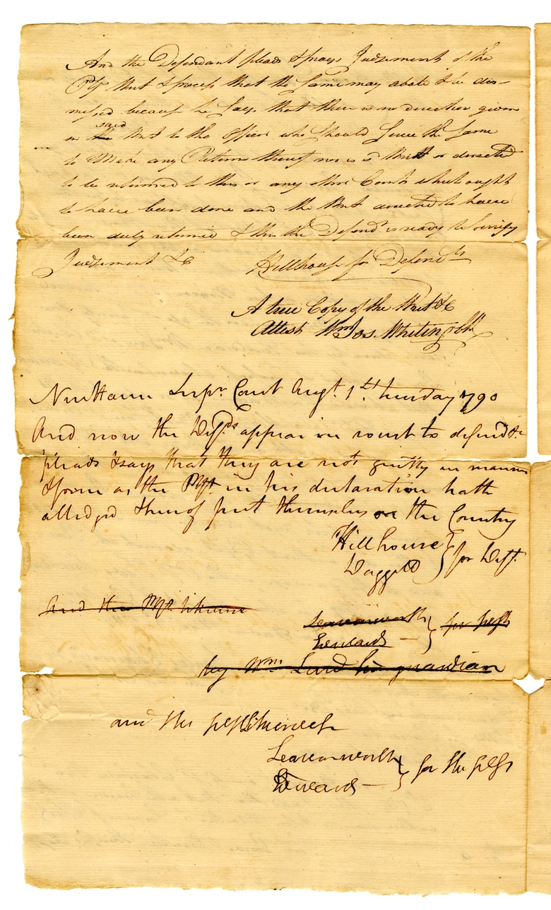 @hampton_vs_martin_clark_execution_case_collection -> subject -> [@executions, @legal_proceedings, @judgments, @black_african_american_and_indigenous_history]And the Defendant pleads prayers, Judgments of the Piffs. And I swer that the same may adeate & be accom- meted, because to say that there is no evidence given in the book to the Officer who should serve the same to which any Patron must now as I think or otherwise to be admitted to them or any other Comt's shall ought to have been done and the most amuch to have been duly returned I thin the Defendant wrong the Judgey Judgment &c Bullhous for Defend A true Copy of the Writ &c Attest Wm Jos Whittington Northham Supr Court Augt 1st hunday 790 And now the Defs appear in court to defend & I thereby say that they are not guilty in manner youre as the Piff in his declaration hath alleged thereof just themselves or the Country Will house of Dagget and the Rep Schinech Leavenworth for the Piffs