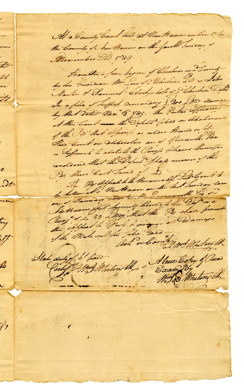 At a County Court held at New Haven within & to the county of New Haven on the fourth Tuesday of November 2d, 1789. Hamilton of New Haven of Churchers in County by his Guardian Mr. Law & C. Churcher Esq. & Adam Martin & Samuel Clark Esqs. of Churchers District In a plea of Suffice remonstrance I was Dmy Remedy by Writ dated Nov. 6th 1789. The Parties appeared at this Court were the Plaintiff & Pleas or Attachments of the Py & Writ Appeal as under hand &c. This Court on deliberation are of Opinion the Py is Apprised to attend to the Party's Shares thereupon considered that the Point in Stake remains of the Py their Lord Sarah &c. The Py Appeals to the Cromwell Dist Court to be taken at New Haven on the last Thursday saw one of January next & at Cromwell Py to New Haven first formerly known to the Py as a Reg'd &c. So Dmy: that the Py shall promulgate the Appeal & Effects I am sure at Damage if she will not be false Lord. Ask o County & Wm Whitney Jr. State dutyd 61 hour Clerk of Wm Whitney Jr. Above Copy of Recas Exam'd by Wm Sos Whitney Esq.