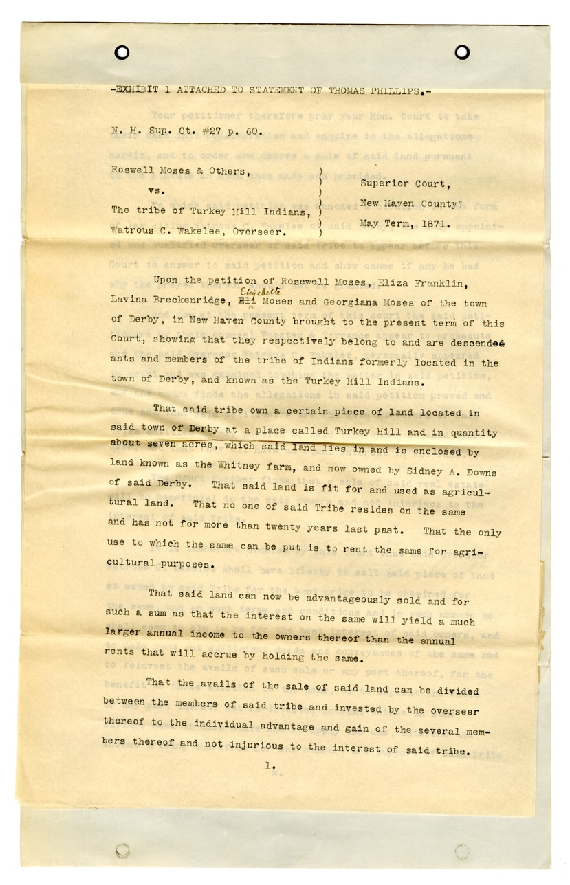 @file_rg003_nhsc_baai_ps_indigenouscases_mosesvsturkeyhill_a_003_tif:file {filename: "RG003_NHSC_BAAI_PS_IndigenousCases_MosesvsTurkeyHill_A_003.tif.ref.json", type: "Image/Asset with OCR"}-EXHIBIT 1 ATTACHED TO STATEMENT OF THOMAS PHILLIPS. Your petitioner therefore pray your Hon. Court to take N. H. Sup. Ct. #27 p. 60. Roswell Moses & Others, vs. The tribe of Turkey Hill Indians, Watrous C. Wakelee, Overseer. Superior Court, New Haven County, May Term, 1871. Upon the petition of Roswell Moses, Eliza Franklin, Elizabeth Moses and Georgiana Moses of the town of Derby, in New Haven County brought to the present term of this Court, showing that they respectively belong to and are descendants and members of the tribe of Indians formerly located in the town of Derby, and known as the Turkey Hill Indians. That said tribe own a certain piece of land located in said town of Derby at a place called Turkey Hill and in quantity about seven acres, which said land lies in and is enclosed by land known as the Whitney farm, and now owned by Sidney A. Downs of said Derby. That said land is fit for and used as agricultural land. That no one of said Tribe resides on the same and has not for more than twenty years last past. That the only use to which the same can be put is to rent the same for agricultural purposes. That said land can now be advantageously sold and for such a sum as that the interest on the same will yield a much larger annual income to the owners thereof than the annual rents that will accrue by holding the same. That the avails of the sale of said land can be divided between the members of said tribe and invested by the overseer thereof to the individual advantage and gain of the several members thereof and not injurious to the interest of said tribe.