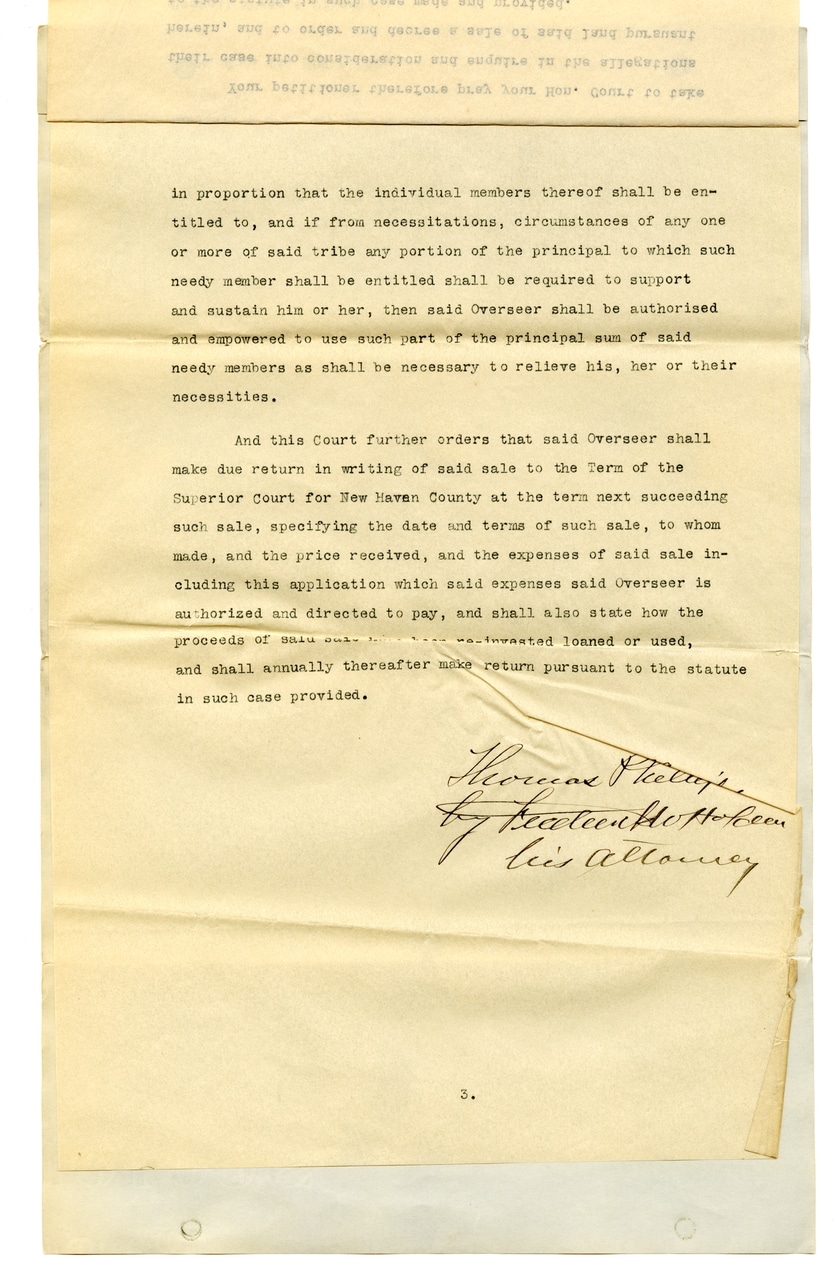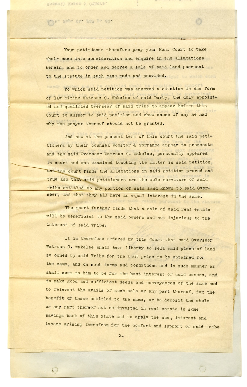 Your petitioner therefore pray your Hon. Court to take their case into consideration and enquire in the allegations herein, and to order and decree a sale of said land pursuant to the statute in such case made and provided. To which said petition was annexed a citation in due form of law citing Watrous C. Wakelee of said Derby, the duly appointed and qualified Overseer of said tribe to appear before this Court to answer to said petition and show cause if any he had why the prayer thereof should not be granted. And now at the present term of this court the said petitioners by their counsel Wooster & Torrance appear to prosecute and the said Overseer Watrous C. Wakelee, personally appeared in court and was examined touching the matter in said petition, and the court finds the allegations in said petition proved and true and that said petitioners are the sole survivors of said tribe entitled to any portion of said land known to said Overseer, and that they all have an equal interest in the same. The court further finds that a sale of said real estate will be beneficial to the said owners and not injurious to the interest of said Tribe. It is therefore ordered by this Court that said Overseer Watrous C. Wakelee shall have liberty to sell said piece of land so owned by said Tribe for the best price to be obtained for the same, and on such terms and conditions and in such manner as shall seem to him to be for the best interest of said owners, and to make good and sufficient deeds and conveyances of the same and to reinvest the avails of such sale or any part thereof, for the benefit of those entitled to the same, or to deposit the whole or any part thereof not re-invested in real estate in some savings bank of this State and to apply the use, interest and income arising therefrom for the comfort and support of said tribe