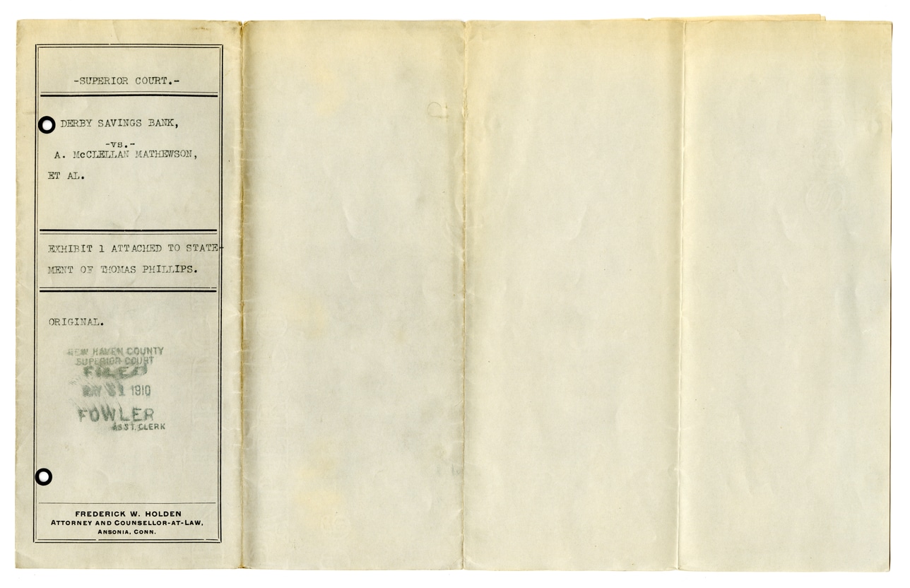 @derby_savings_bank_vs_mathewson_exhibit:collection {title: "Derby Savings Bank vs. Mathewson Exhibit", description: "Exhibit related to the legal case of Derby Savings Bank vs. A. McClellan Mathewson, including an attached statement by Thomas Phillips.", creator: [@frederick_w_holden], institution: @connecticut_state_library, place: @ansonia_connecticut, subjects: ["Legal documents","Superior Court","Derby Savings Bank","A. McClellan Mathewson","Thomas Phillips"]}