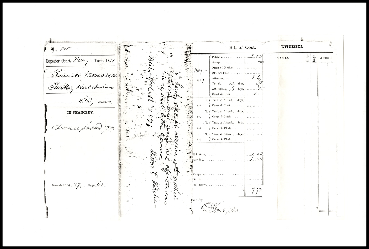 No. 585 Superior Court, May Term, 1871 Roswell Moses &c. Co. vs. Turkey Hill Indians W. F. T., Solicitor. IN CHANCERY. Decree passed 7/2 Recorded Vol. 27, Page 60. Bill of Cost. <table> <tr> <th>Petition</th> <td>2.00</td> <th>NAMES</th> <th>Miles</th> <th>Days</th> <th>Amount.</th> </tr> <tr> <td>Stamp</td> <td></td> <td></td> <td></td> <td></td> <td></td> </tr> <tr> <td>Order of Notice</td> <td></td> <td></td> <td></td> <td></td> <td></td> </tr> <tr> <td>Officer's Fees</td> <td></td> <td></td> <td></td> <td></td> <td></td> </tr> <tr> <td>Attorney</td> <td>2.68</td> <td></td> <td></td> <td></td> <td></td> </tr> <tr> <td>Travel</td> <td>10 miles, .30</td> <td></td> <td></td> <td></td> <td></td> </tr> <tr> <td>Attendance</td> <td>3 days, .75</td> <td></td> <td></td> <td></td> <td></td> </tr> <tr> <td>Court & Clerk</td> <td></td> <td></td> <td></td> <td></td> <td></td> </tr> <tr> <td>T. Trav. & Attend.</td> <td>days</td> <td></td> <td></td> <td></td> <td></td> </tr> <tr> <td>187</td> <td>Court & Clerk</td> <td></td> <td></td> <td></td> <td></td> </tr> <tr> <td>T. Trav. & Attend.</td> <td>days</td> <td></td> <td></td> <td></td> <td></td> </tr> <tr> <td>187</td> <td>Court & Clerk</td> <td></td> <td></td> <td></td> <td></td> </tr> <tr> <td>T. Trav. & Attend.</td> <td>days</td> <td></td> <td></td> <td></td> <td></td> </tr> <tr> <td>187</td> <td>Court & Clerk</td> <td></td> <td></td> <td></td> <td></td> </tr> <tr> <td>T. Trav. & Attend.</td> <td>days</td> <td></td> <td></td> <td></td> <td></td> </tr> <tr> <td>187</td> <td>Court & Clerk</td> <td></td> <td></td> <td></td> <td></td> </tr> <tr> <td>Bill in form</td> <td></td> <td></td> <td></td> <td></td> <td>1.00</td> </tr> <tr> <td>Recording</td> <td></td> <td></td> <td></td> <td></td> <td>1.00</td> </tr> <tr> <td>Subpoena</td> <td></td> <td></td> <td></td> <td></td> <td></td> </tr> <tr> <td>Service</td> <td></td> <td></td> <td></td> <td></td> <td></td> </tr> <tr> <td>Witnesses</td> <td></td> <td></td> <td></td> <td></td> <td>1.73</td> </tr> </table> Taxed by Stone, Clerk