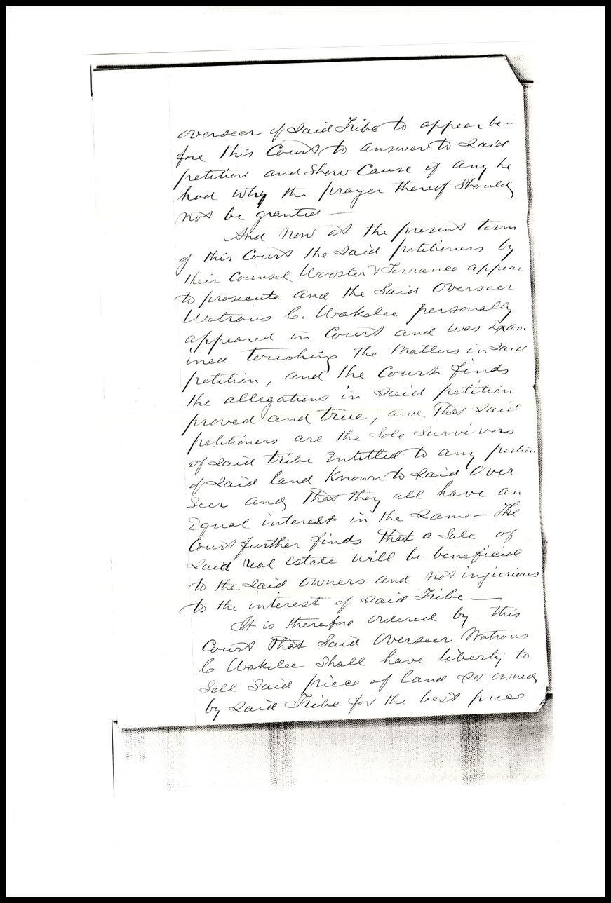 @file_rg003_nhsc_baai_ps_indigenouscases_mosesvsturkeyhill_b_004_tif -> depicts -> @decree_585overseer of said tribe to appear before this court to answer to said petition and show cause if any he had why the prayer thereof should not be granted. And now at the present term of this court the said petitioners by their counsel Worcester Terrance appear to prosecute and the said overseer Watkins C. Wakelee personally appeared in court and was examined touching the matters in said petition, and the court finds the allegations in said petition proved and true, and that said petitioners are the sole survivors of said tribe entitled to any portion of said land known to said overseer and that they all have an equal interest in the same. The court further finds that a sale of said real estate will be beneficial to the said owners and not injurious to the interest of said tribe. It is therefore ordered by this court that said overseer Watkins C. Wakelee shall have liberty to sell said pieces of land 80 acres by said tribe for the best price.