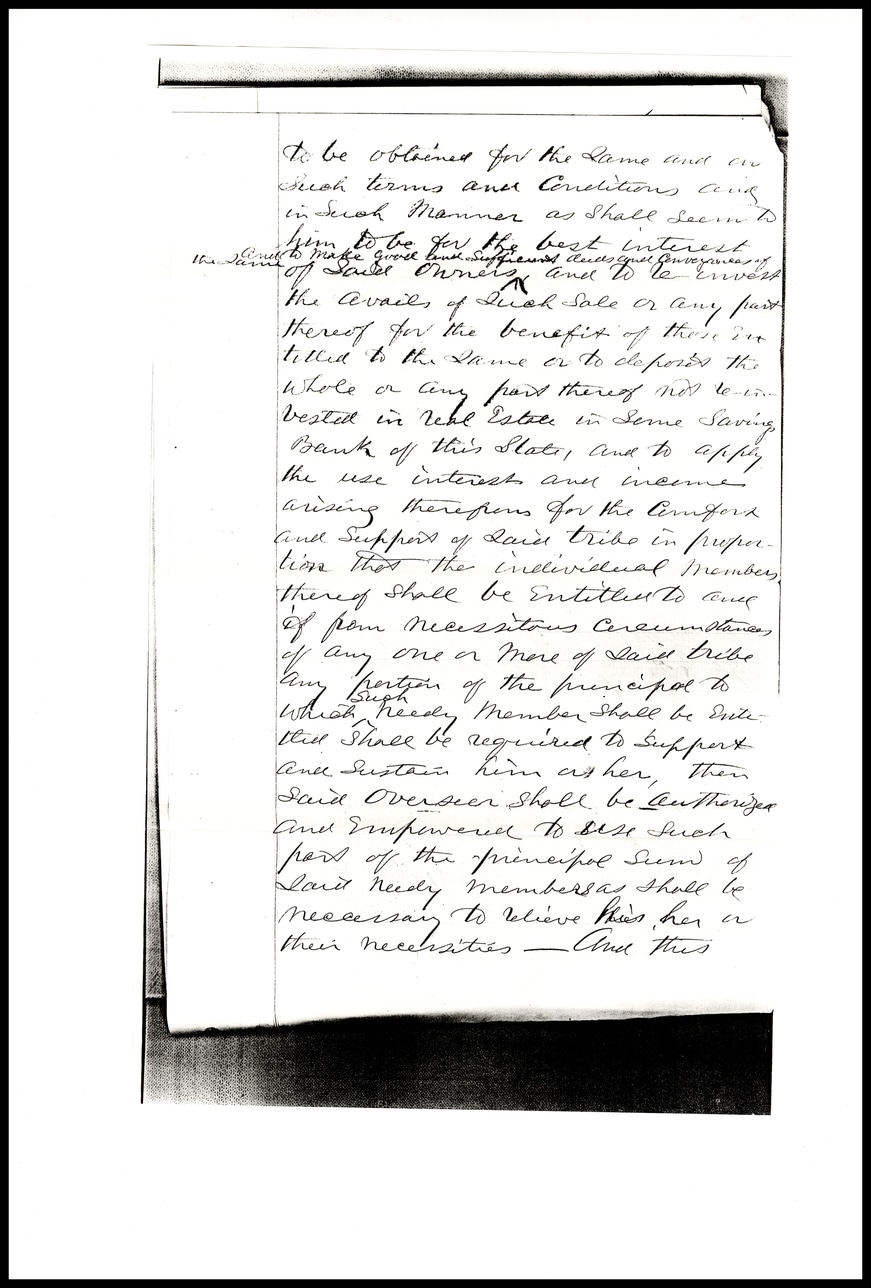 to be obtained for the same and on such terms and conditions, and in such manner as shall seem to him to be for the best interest of the sale of said lands and the proceeds thereof, and to re-invest the proceeds of such sale or any part thereof for the benefit of those entitled to the same or to deposit the whole or any part thereof not re-invested in real estate in some saving bank of this State, and to apply the use interests and income arising therefrom for the comfort and support of said tribe in proportion that the individual members thereof shall be entitled to care of from necessitous circumstances, if any one or more of said tribe being portion of the principal to which needy member shall be entitled shall be required to support and sustain him or her, then said overseer shall be authorized and empowered to sell such part of the principal sum of said needy members as shall be necessary to relieve him, her or their necessities—and thus