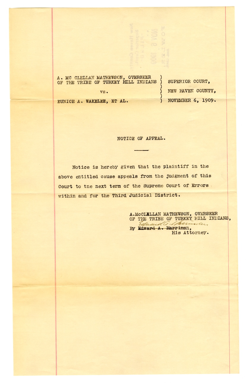 A. MC CLELLAN MATHEWSON, OVERSEER OF THE TRIBE OF TURKEY HILL INDIANS vs. EUNICE A. WAKELEE, ET AL. SUPERIOR COURT, NEW HAVEN COUNTY, NOVEMBER 6, 1909. NOTICE OF APPEAL. Notice is hereby given that the plaintiff in the above entitled cause appeals from the judgment of this Court to the next term of the Supreme Court of Errors within and for the Third Judicial District. A. McCLELLAN MATHEWSON, OVERSEER OF THE TRIBE OF TURKEY HILL INDIANS, By Edward A. Harriman, His Attorney.