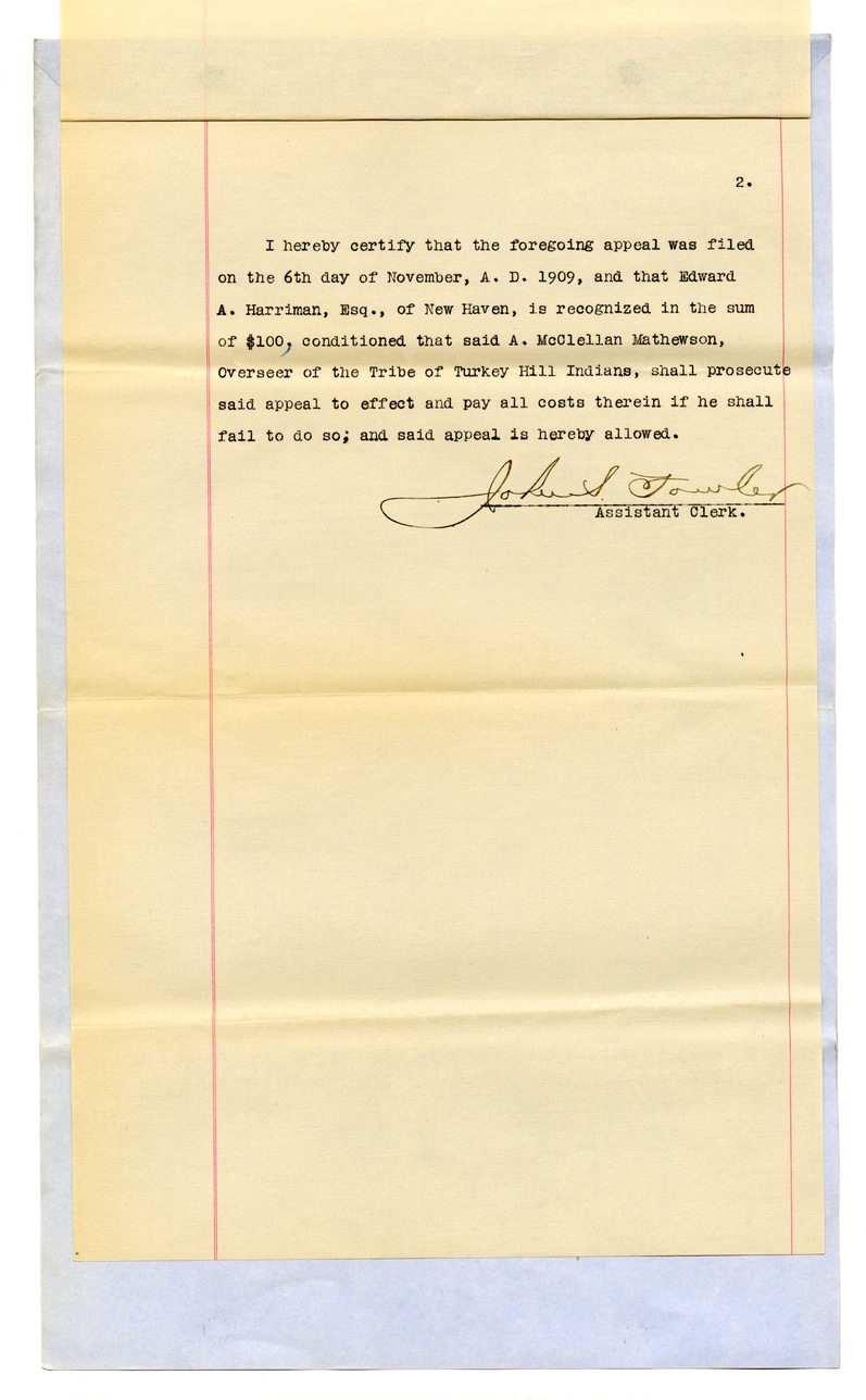 I hereby certify that the foregoing appeal was filed on the 6th day of November, A.D. 1909, and that Edward A. Harriman, Esq., of New Haven, is recognized in the sum of $100, conditioned that said A. McClellan Mathewson, Overseer of the Tribe of Turkey Hill Indians, shall prosecute said appeal to effect and pay all costs therein if he shall fail to do so; and said appeal is hereby allowed. [signature] Assistant Clerk.