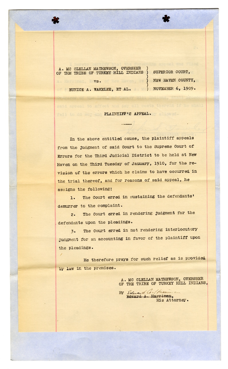 @mathewson_vs_wakelee:event -> subject -> @indigenous_casesA. MC CLELLAN MATHEWSON, OVERSEER OF THE TRIBE OF TURKEY HILL INDIANS vs. EUNICE A. WAKELEE, ET AL. SUPERIOR COURT, NEW HAVEN COUNTY, NOVEMBER 6, 1909. PLAINTIFF'S APPEAL. In the above entitled cause, the plaintiff appeals from the judgment of said Court to the Supreme Court of Errors for the Third Judicial District to be held at New Haven on the Third Tuesday of January, 1910, for the revision of the errors which he claims to have occurred in the trial thereof, and for reasons of said appeal, he assigns the following: 1. The Court erred in sustaining the defendants' demurrer to the complaint. 2. The Court erred in rendering judgment for the defendants upon the pleadings. 3. The Court erred in not rendering interlocutory judgment for an accounting in favor of the plaintiff upon the pleadings. He therefore prays for such relief as is provided by law in the premises. A. MC CLELLAN MATHEWSON, OVERSEER OF THE TRIBE OF TURKEY HILL INDIANS, By Edward A. Harriman, His Attorney.
