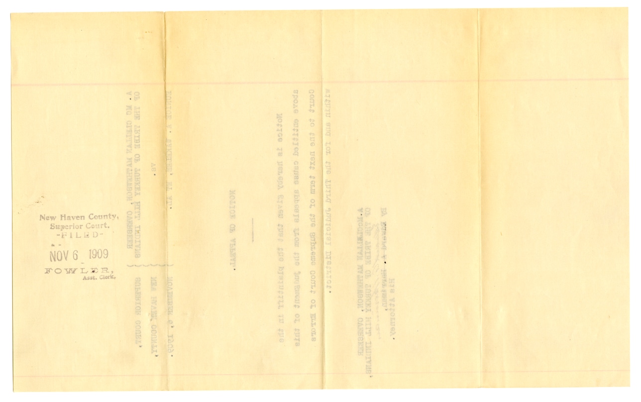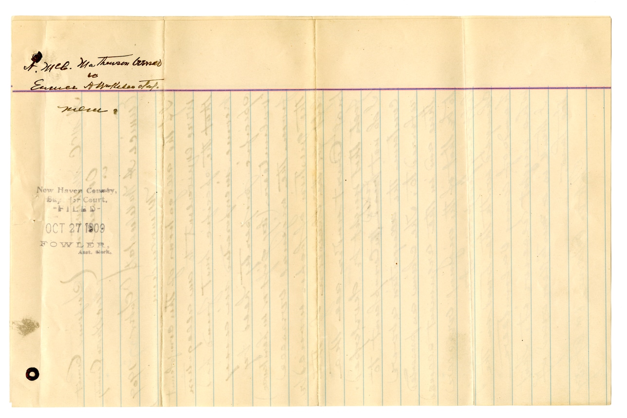 @file_rg003_nhsc_baai_ps_indigenouscases_mathewsonvswakelee_026_jpg:file {type: "Image/Asset with OCR", ocr_text: "New Haven County, Superior Court. FILED NOV 6 1909 FOWLER, Asst. Clerk."}F. McC. Ma. Thomson Comed to Eunice A. McKeen Esq. New Haven County, Sey, 1st Court. FILE D OCT 27 1909 FOWLER, Assist. Clerk.
